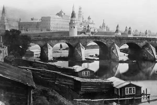 Фотография Роджера Фентона 1852 г., на которой запечатлен Большой каменный мост 17 века. Этот уникальный памятник архитектуры допетровской Москвы уничтожили в 1858 г. со стандартной формулировкой "за ветхостью". На остатках старых опор построили новый железный мост, который в 1938 г. заменили на ныне существующий.