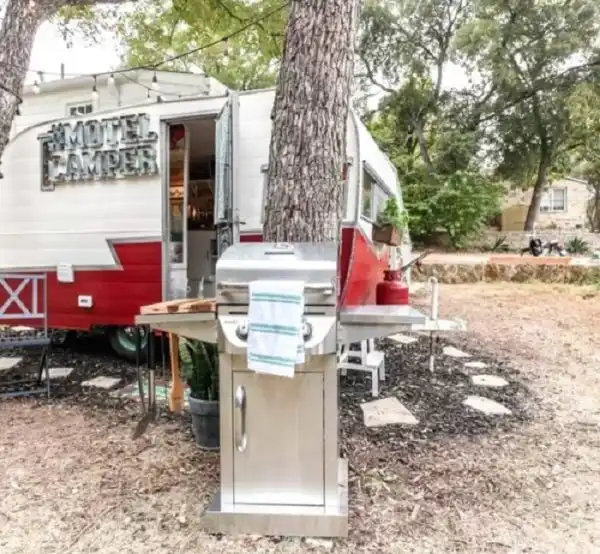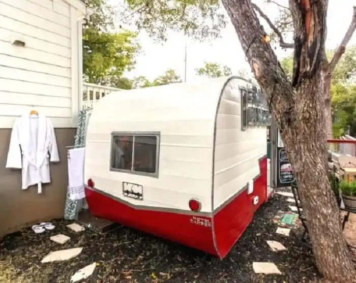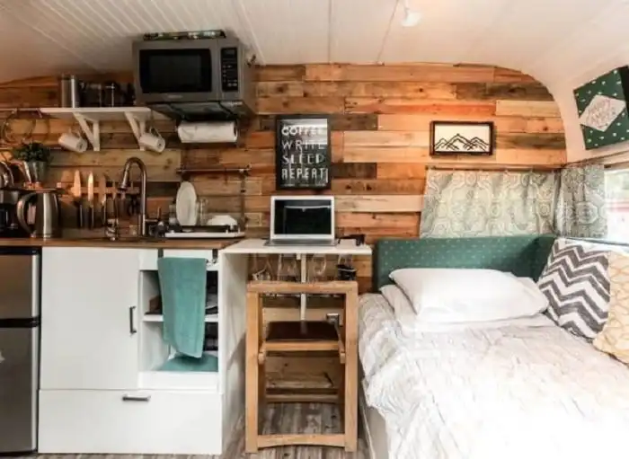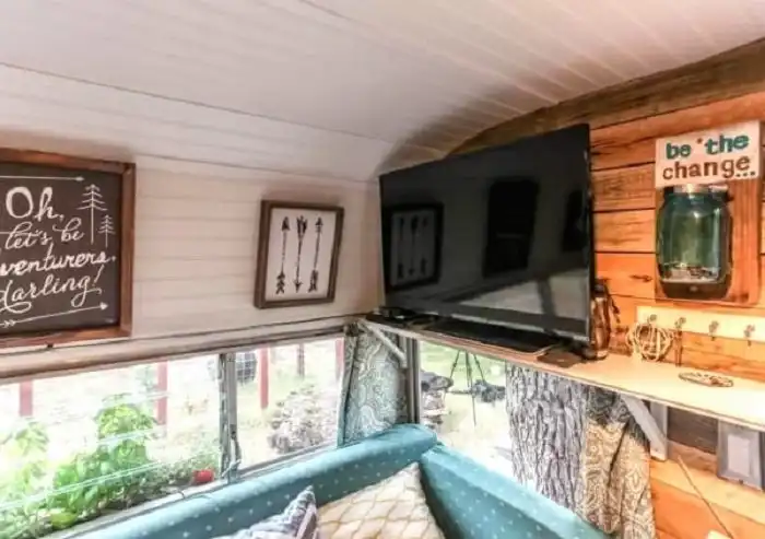 Хозяин превратил обычный домик на колесах в уютный отель из одного номера. Кроме того, здесь есть на что посмотреть. Из окна кемпера, например, открывается прекрасный вид на лесистую местность!