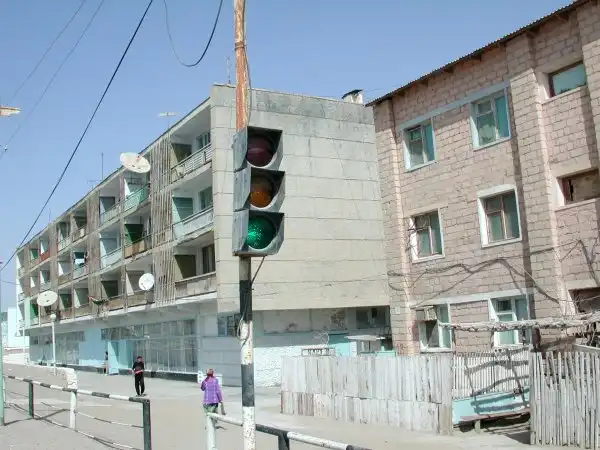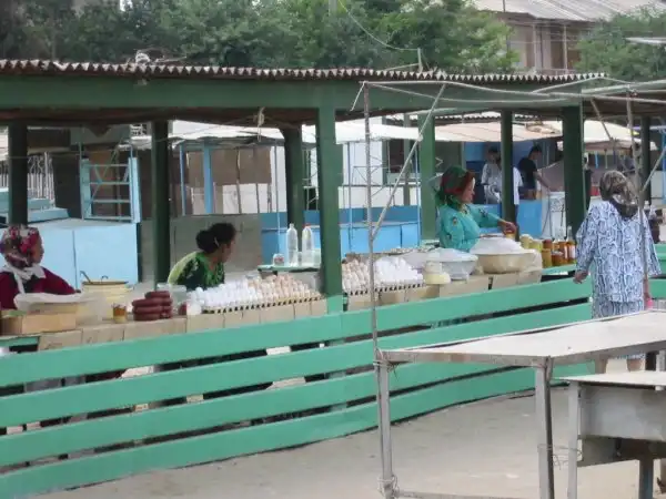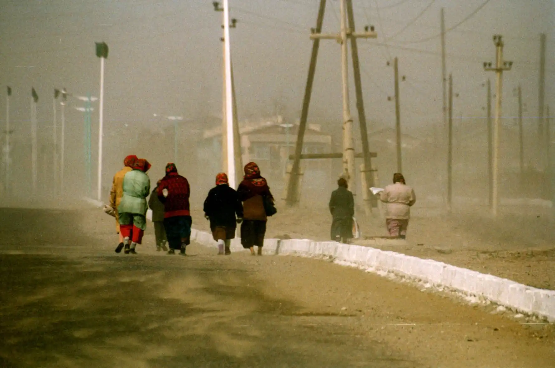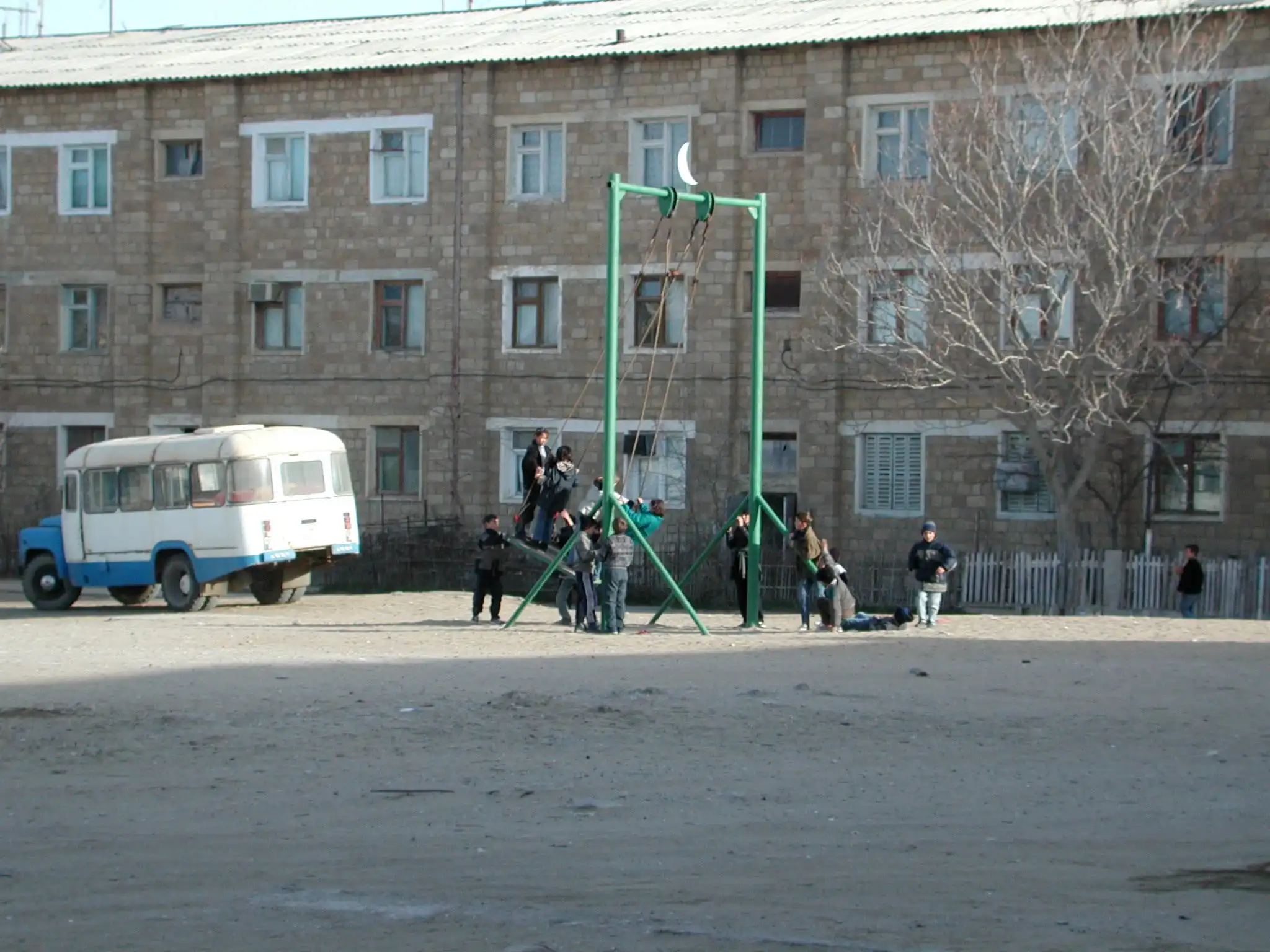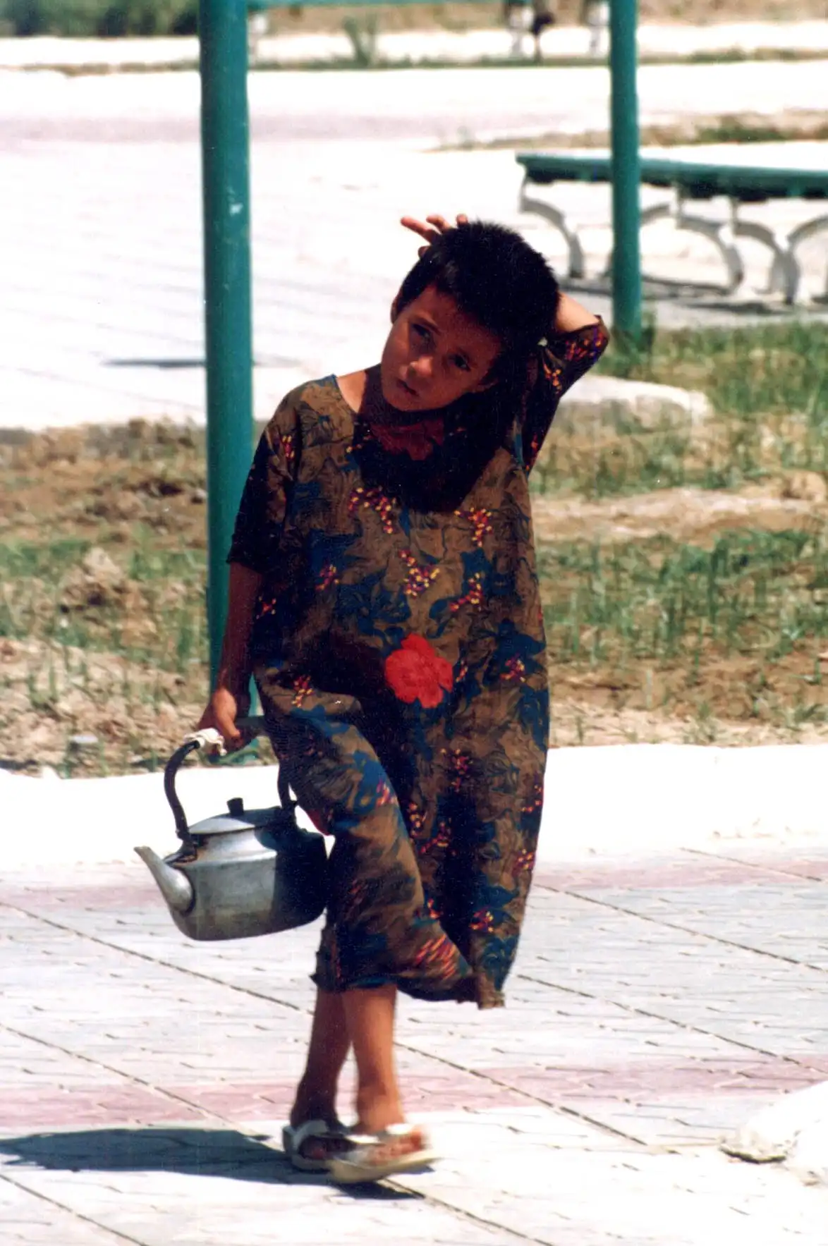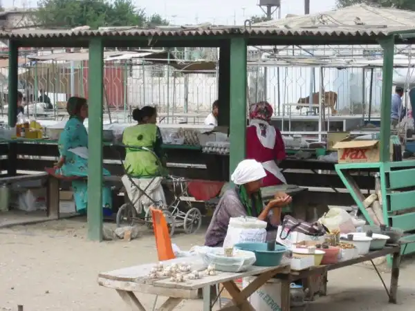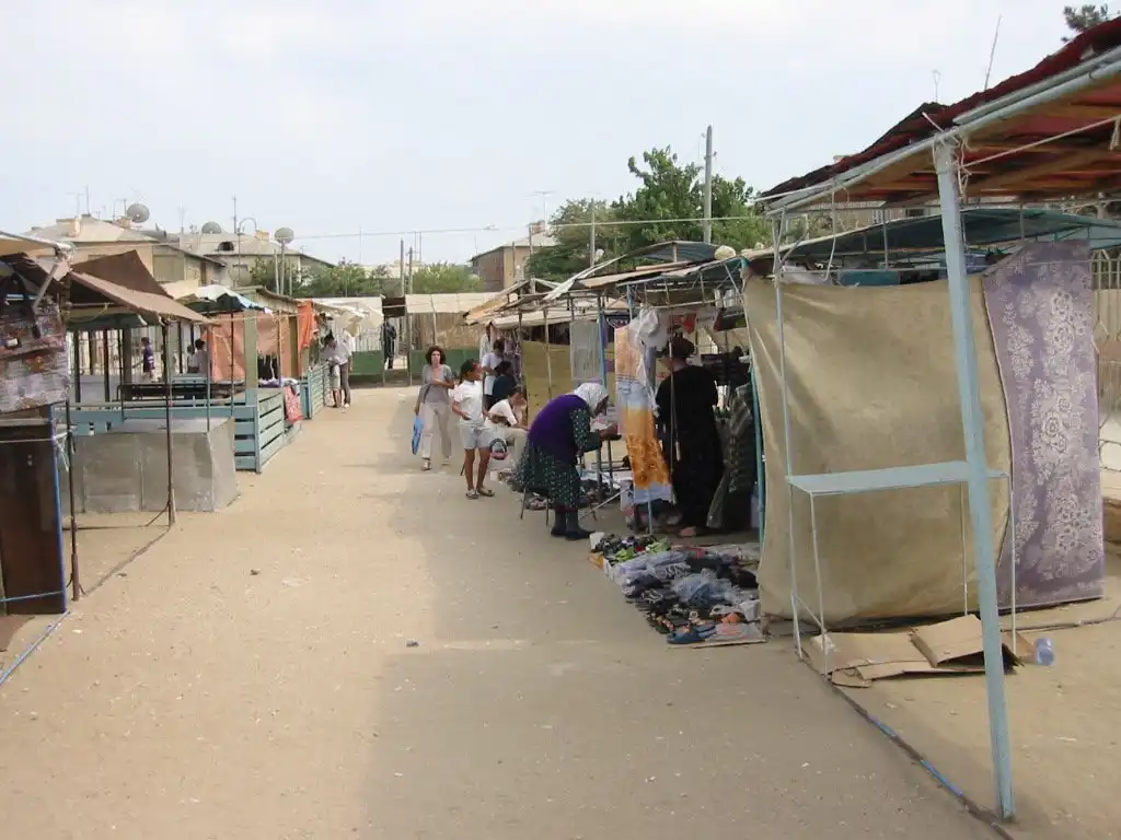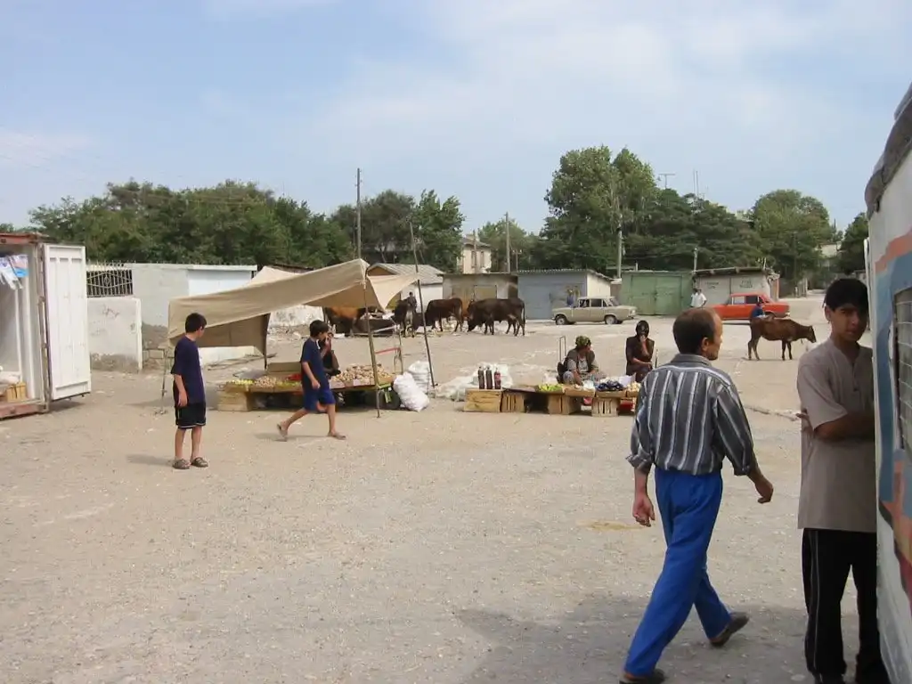 Центр каждого восточного города – базар. Сейчас базар переехал и выглядит вполне цивилизованно, с каменными зданиями по периметру и кучей магазинов, где можно купить практически всё, а вот так выглядел старый базар в 1990-е начале 2000-х. Народу негусто. В лучшие годы в городе жило 35000 человек, но в 90-е население сильно сократилось, большинство русских семей уехало, и осталось не больше 20000. Так что городок небольшой.