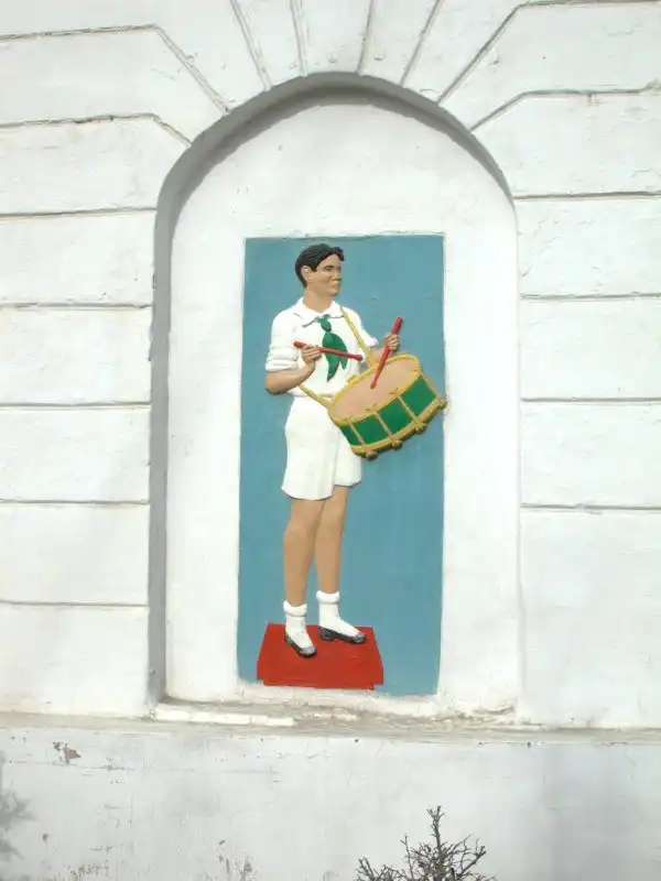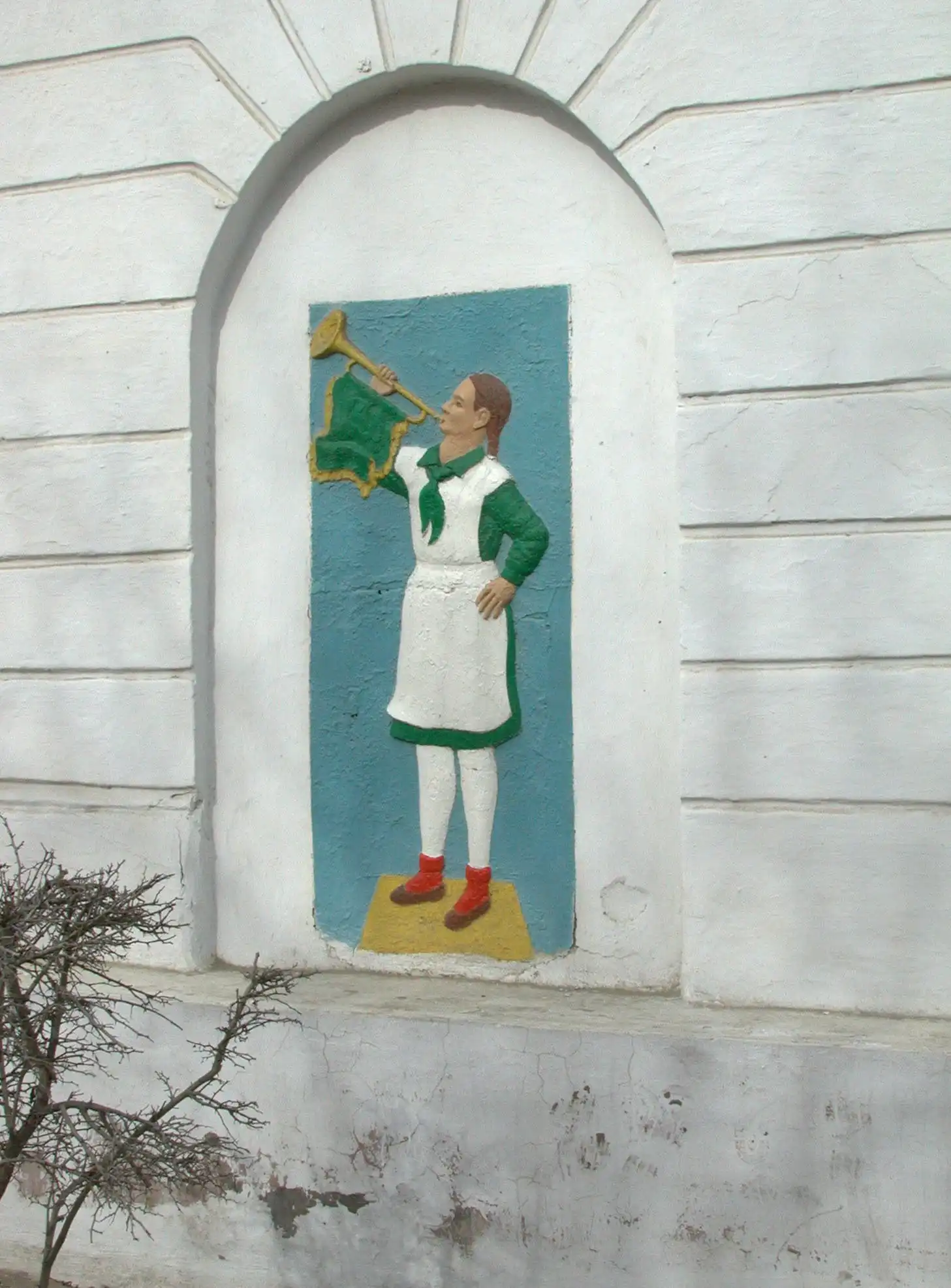 На входных стелах перед школой – барельефы пионеров. На фотографиях они уже перекрашены в национальные цвета, а раньше галстуки были красными. Теперь барельефы вообще скололи….