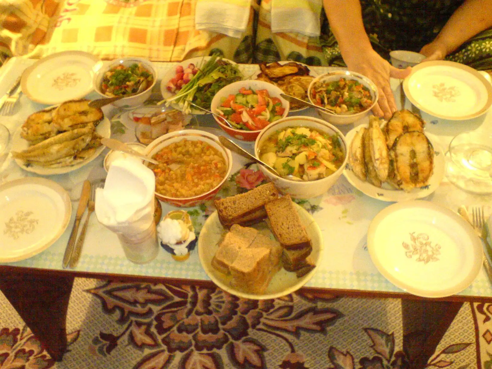 Вот типичный праздничный обед. Отметьте здоровые куски жареной осетрины – это в порядке вещей здесь. Редкий стол в праздник обходится без шашлыка из осетрины.