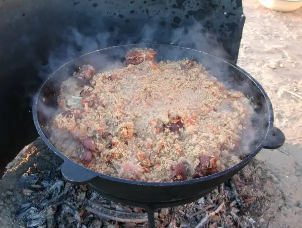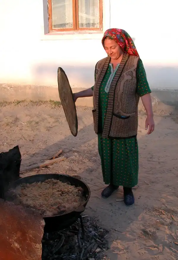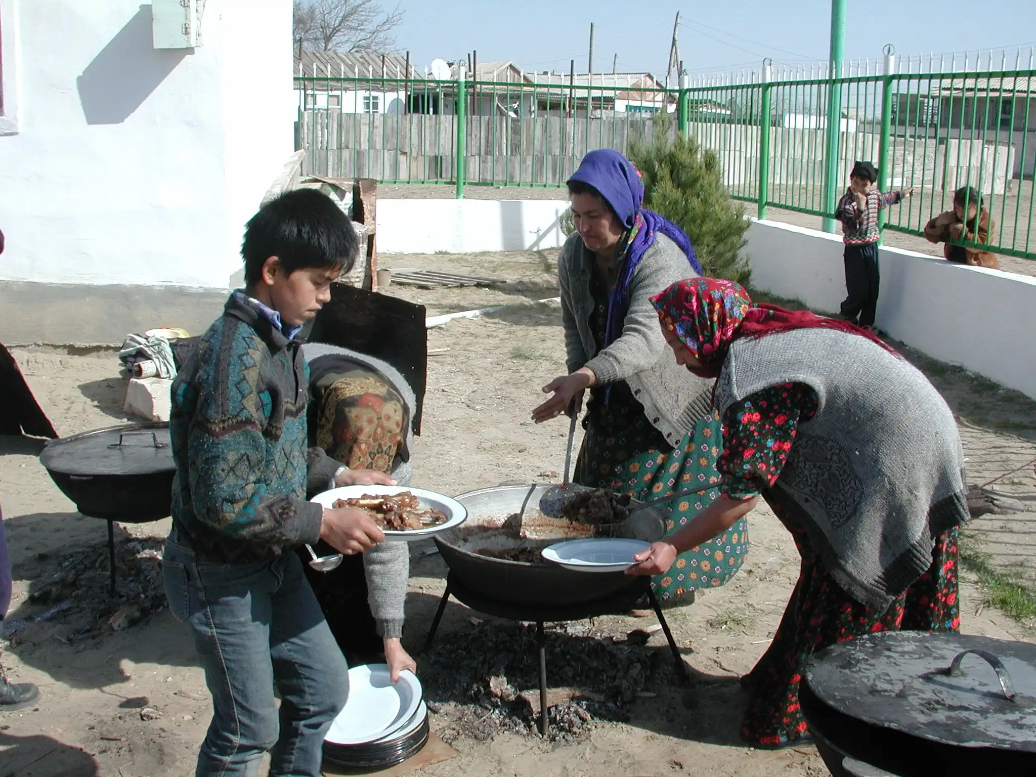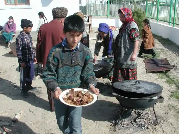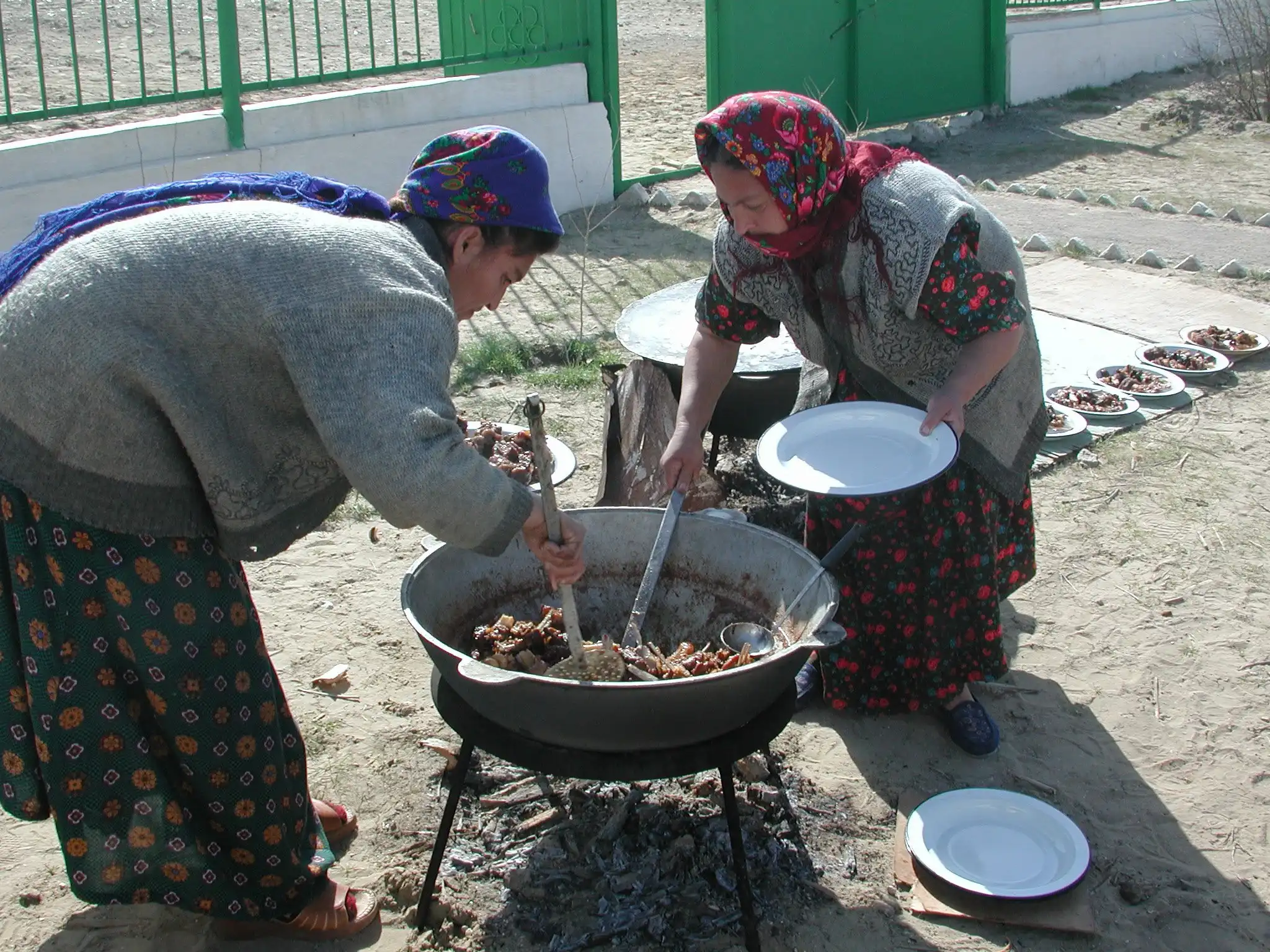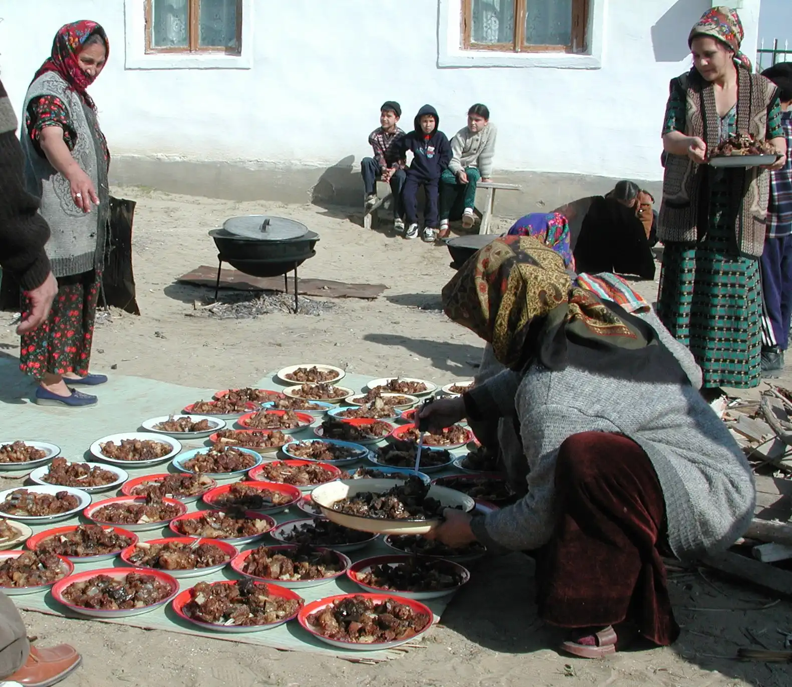 А теперь нечто очень особенное… Туркмены – мусульмане-сунниты. Религиозные традиции здесь очень по-доброму почитаются… Если кто-то хочет принести особенную жертву Богу, то устраивается садака – режется баран, и в возблагодарение Господа жарится барашек и варится плов, который едят все приглашённые на это богоугодное мероприятие… Это очень вкусно и по-домашнему.