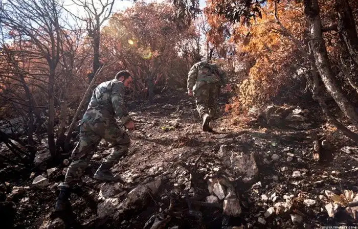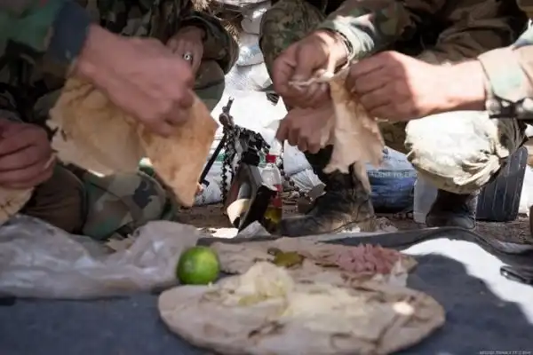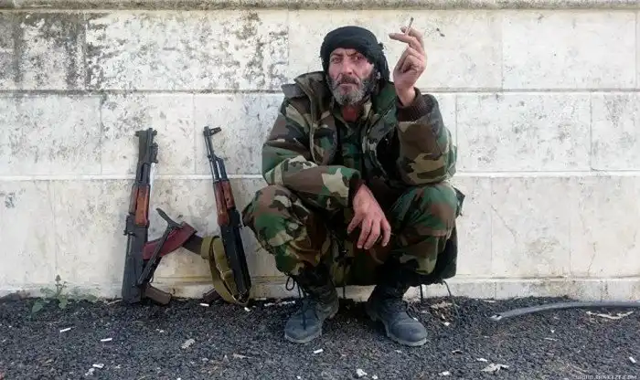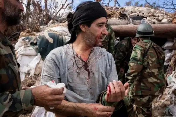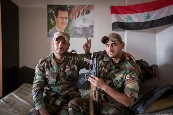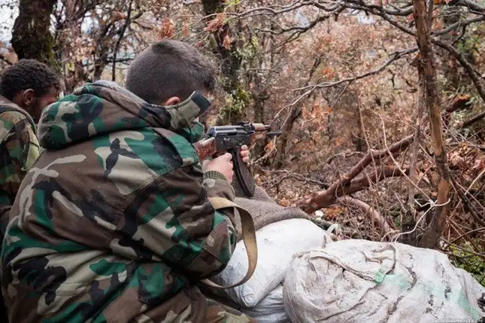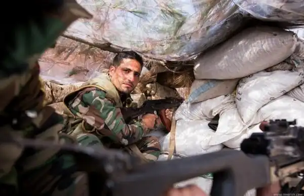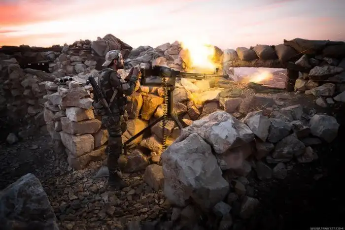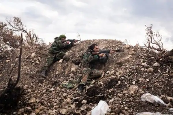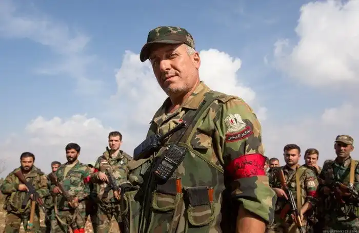 Бои ведутся между террористами с одной стороны и солдатами подразделениями сирийского ополчения "Орлы пустыни" с другой. На переднем плане командир (вроде как даже в звании генерала) одного из подразделений.