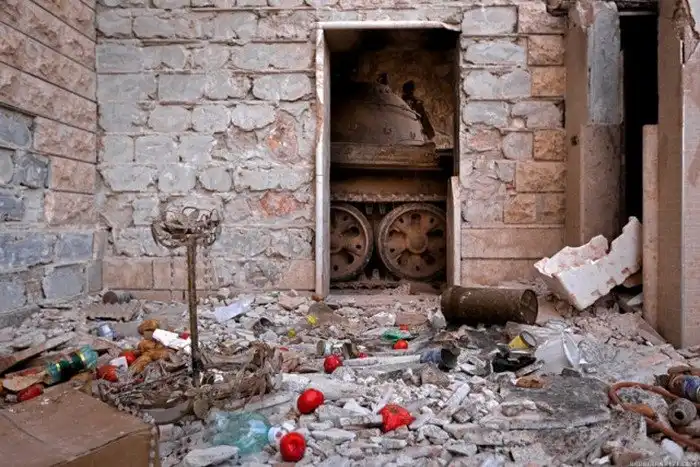 Танк, спрятанный от вражеских беспилотников в доме. Почти всю технику стараются загонять в гаражи или как-либо укрывать.