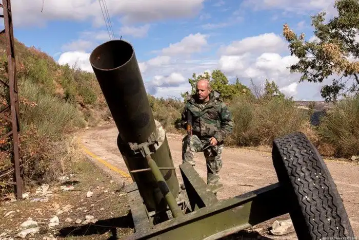 Расчёт 120мм миномёта ведёт огонь по цели.