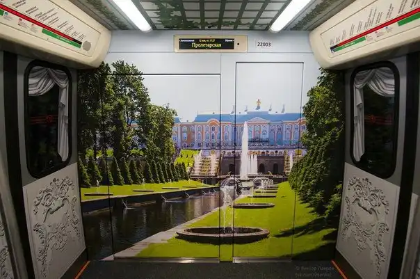 А это двери вагона метро в Санкт-Петербурге, на них специально нарисовали какой-то красивый европейский дворец, чтобы унылые петербуржцы знали, что где-то на западе есть такая красота, которой никогда не будет в России.