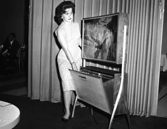 Телевизор с плоским экраном и возможностью записи передач для просмотра в отложенном режиме. США, Чикаго, 1961 год