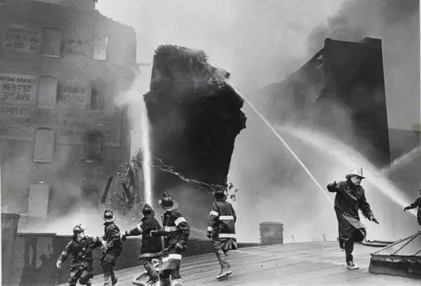 Пожарные убегают от рухнувшей во время пожара стены здания на 137 улице. Нью-Йорк, 18 июля 1962 года
