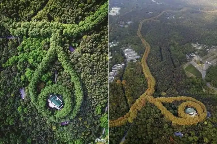 Перед вами уникальный дворец Мэй-Лин в китайском городе Нанкин. Построенный в период между 1931 - 1934 годами дворец являлся резиденцией семьи китайского лидера Чана Кайши, который в 1949 году во время гражданской войны бежал на Тайвань. Дворец был построен для супруги Чана Кайши Сун Мэйлин. Он располагается на холме и с высоты напоминает изумруд на ожерелье. Впечатление изумруда создает зеленая крыша, а само ожерелье - это деревья, высаженные вдоль дороги. В настоящий момент дворец является музеем и открыт для посещения туристов.