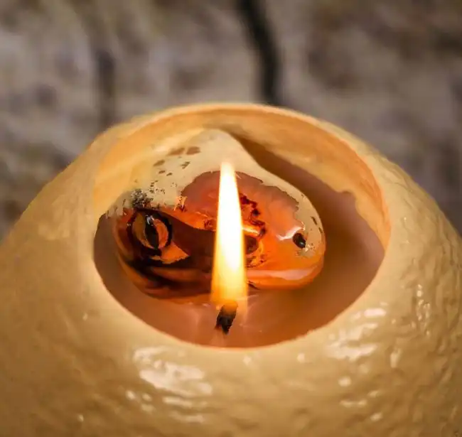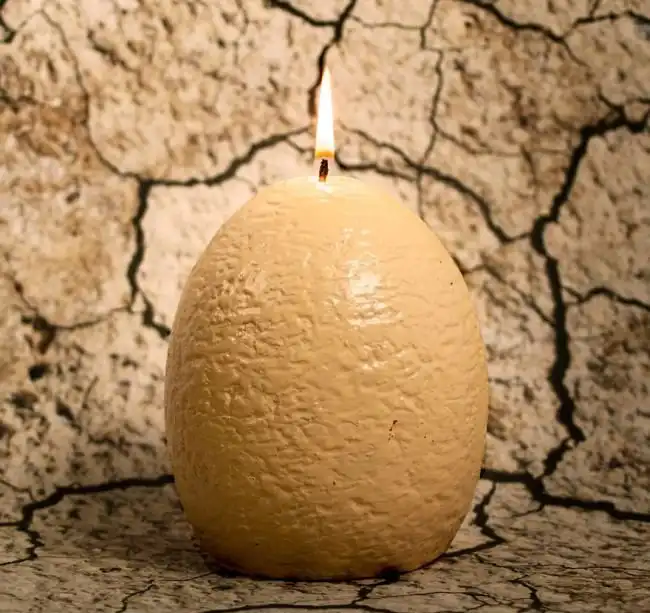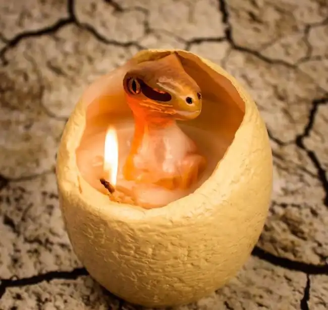 Перед вами не обычная свеча, а декоративная свеча в форме яйца динозавра и внутри нее даже есть маленький динозаврик, появляющийся по мере прогорания свечи.