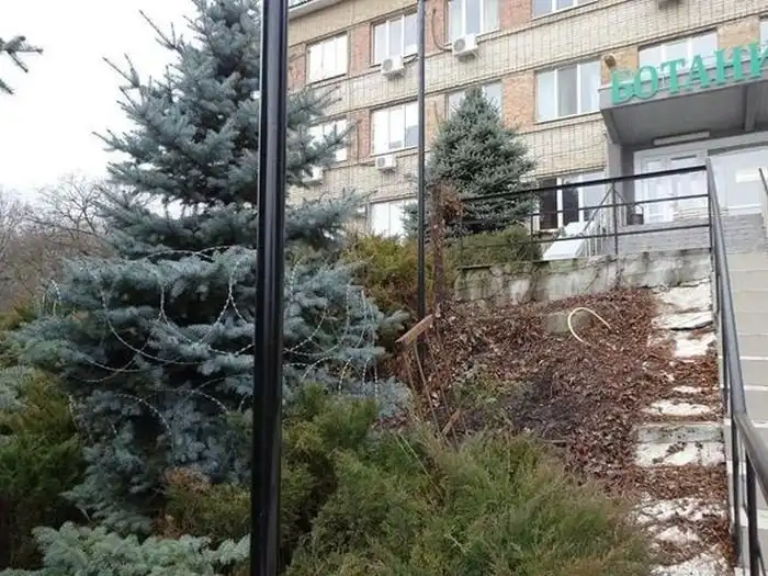Чтобы защитить от вандалов хвойные деревья, растущие в ботаническом саду Южного федерального университета в Ростове-на-Дону, пришлось идти на решительные меры и обнести деревья… колючей проволокой.
