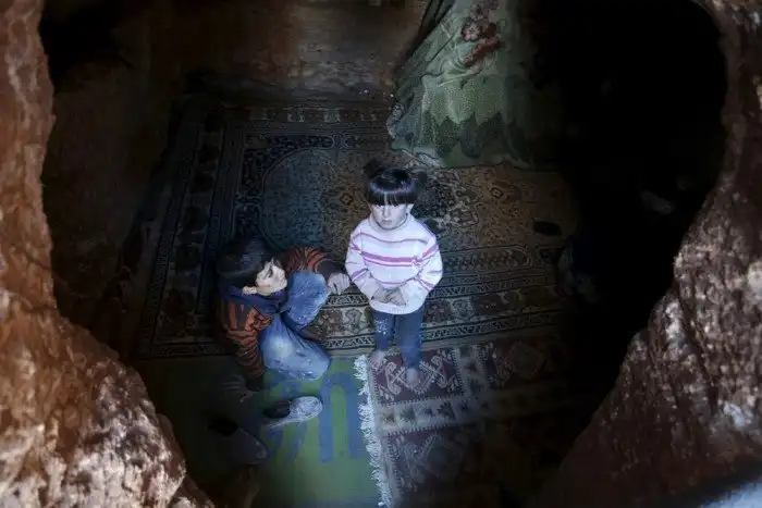 Фотограф Халил Асхави (Khalil Ashawi) побывал на юге Сирии и взглянул на жизнь местных детишек, которые вместе со своими матерями вынуждены прятаться в укрытиях под землей, чтобы не погибнуть от постоянно рвущихся над их головами снарядами.