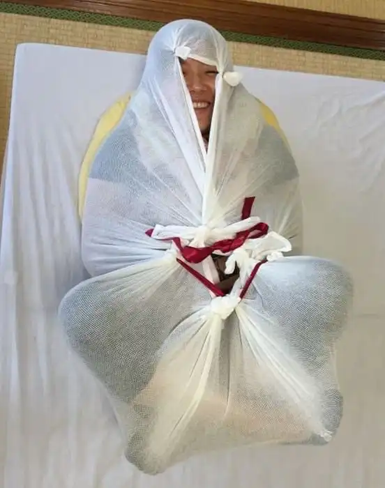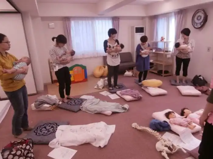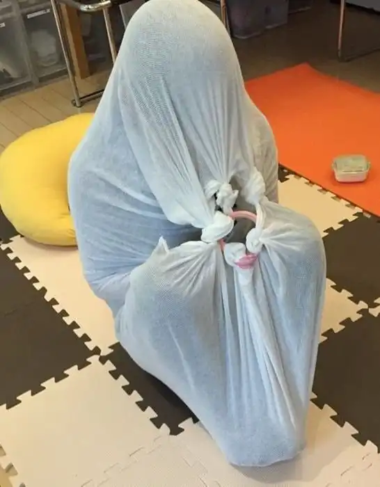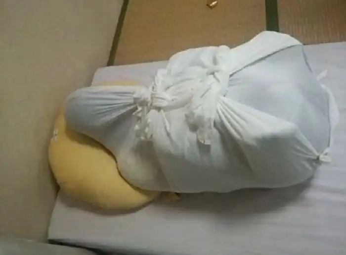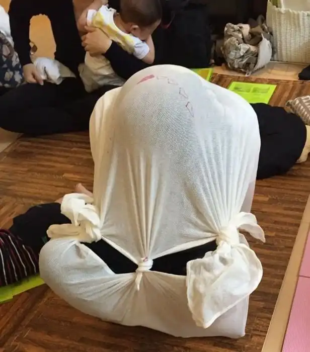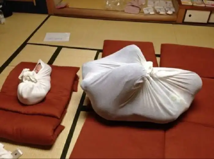 В Японии среди будущих и свежеиспеченных родителей очень популярны специальные курсы, на которых обучают правильному уходу за новорожденными детьми. Один из уроков на курсах посвящен пеленанию малыша. Пеленать ребенка учат разными способами, в том числе, и заворачивать его в какой-то непонятный нам узел. Оказывается, что в такой позе ребенок чувствует себя в безопасности, а чтобы в этом убедились и взрослые, их пеленают вместе с детьми.