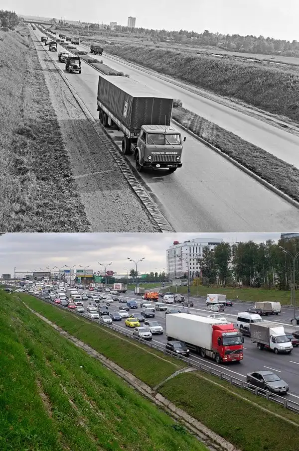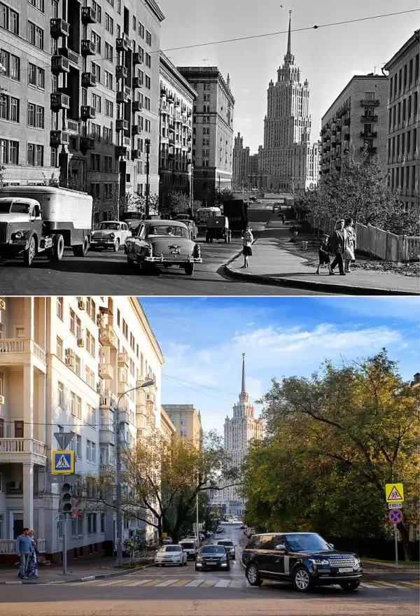 Строительство подземного перехода на Садовой-Кудринской улице, 1963 год. Вид на Садовую-Кудринскую улицу, 2015 год