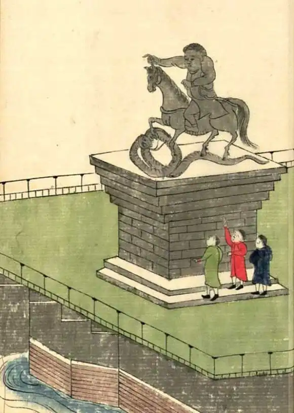 "Медный всадник" в Петербурге. Иллюстрация из свитка "Канкай-ибун" - книги, основанной на показаниях японских моряков, потерпевших крушение корабля у Алеутских островов и проживших в России с 1794 по 1803 г.