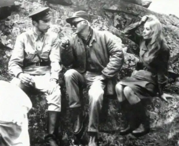 Мартынов, Ростоцкий, Остроумова на съёмках фильма «А зори здесь тихие». Сяргилахта, Карелия, 1971 год