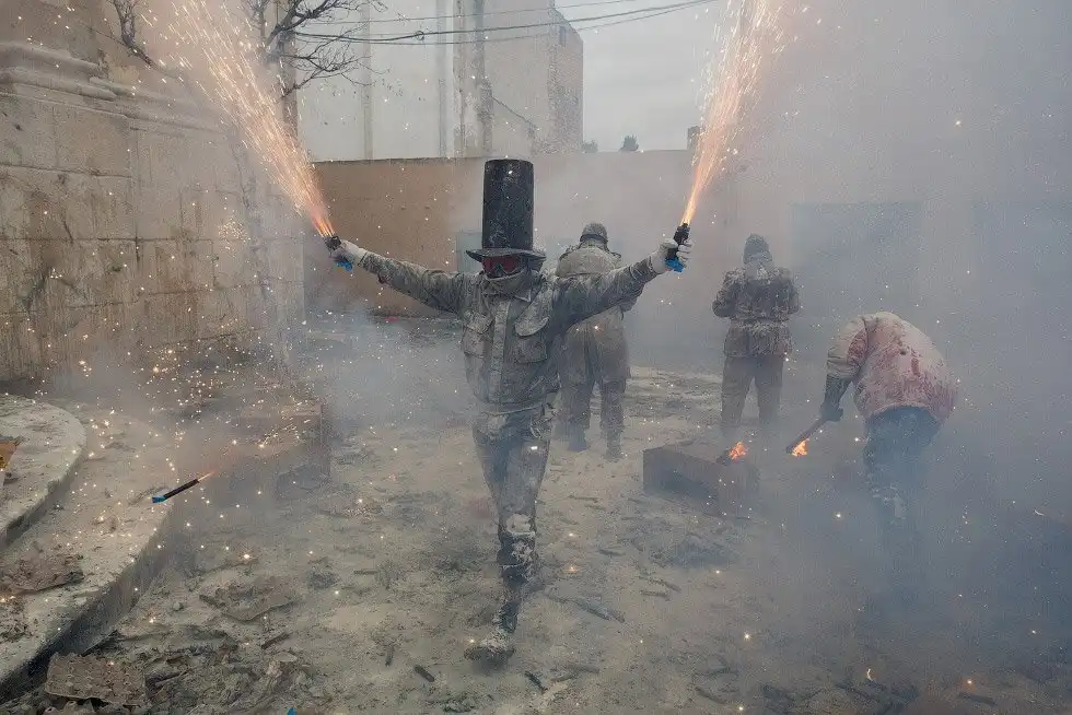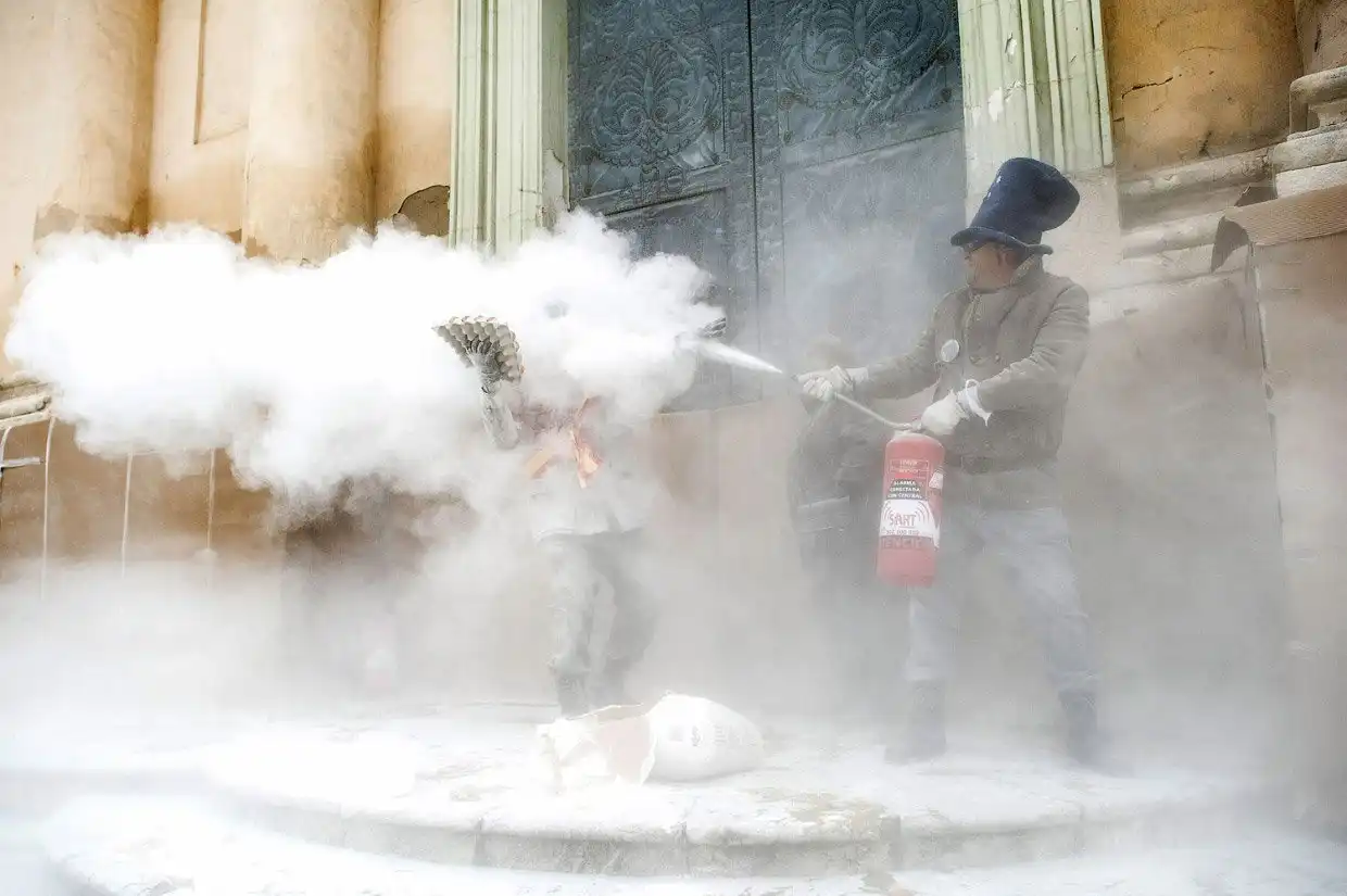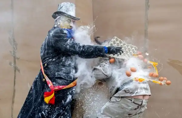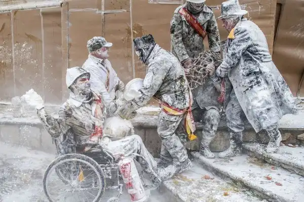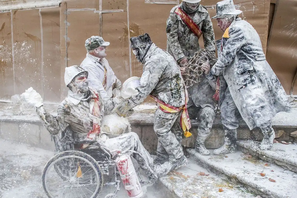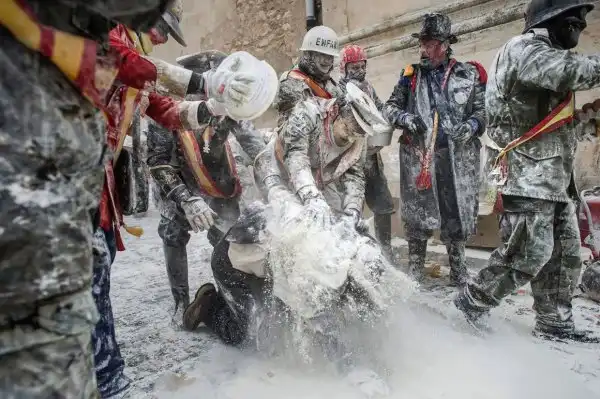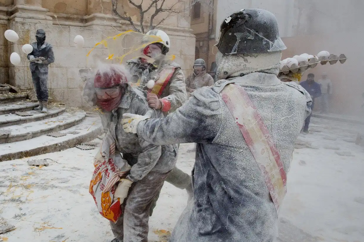 На протяжении вот уже более 200 лет, каждый год 28 декабря в испанском городе Иби в провинции Аликанте проводится фестиваль Els Enfarinats. В этот день на центральной площади устраивается яично-мучная битва: жители города, одетые в старинную военную форму, устраивают настоящее сражение с использованием муки, яиц, петард и огнетушителей.