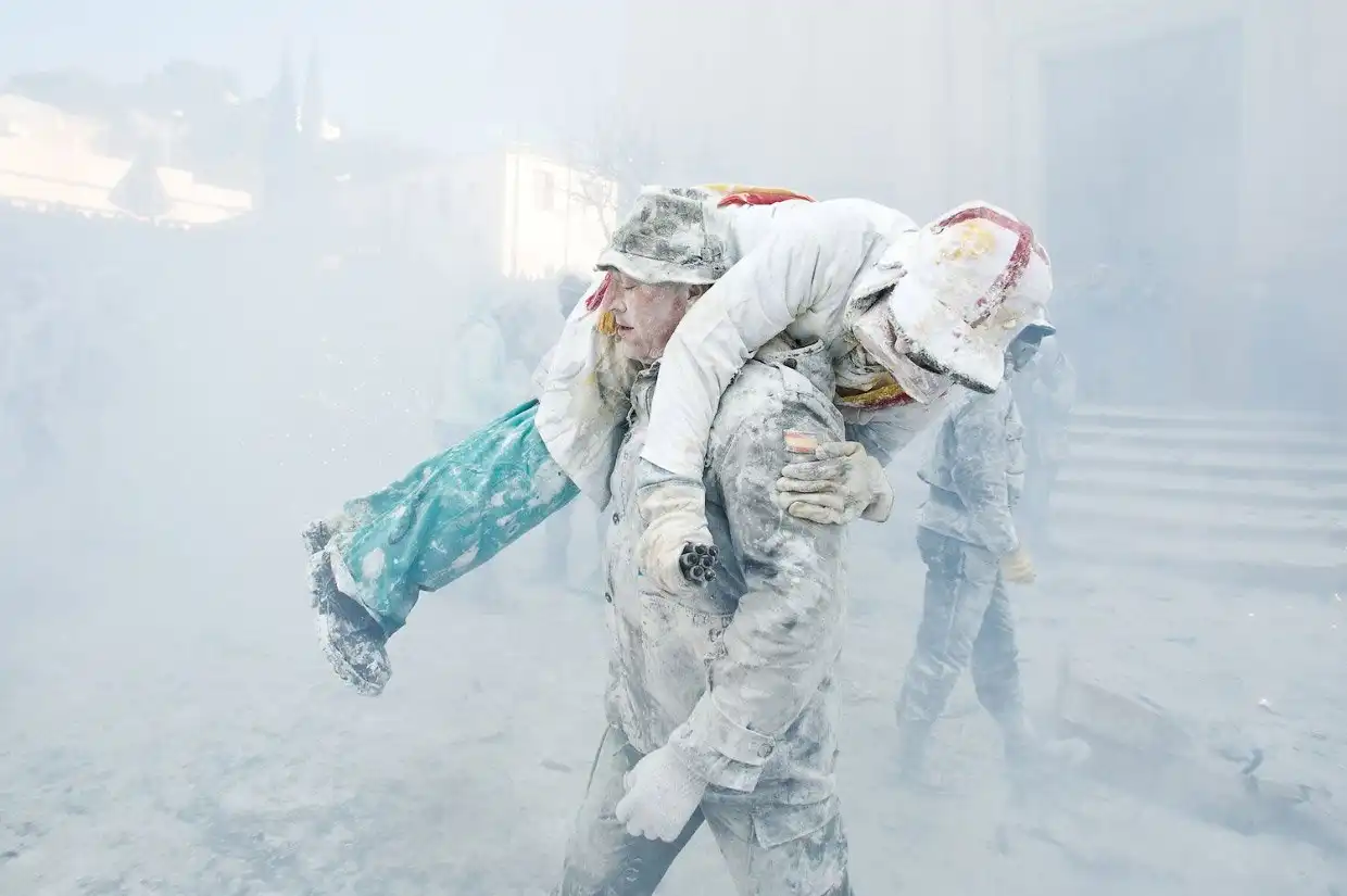 Под конец боев из-за частичек муки в воздухе становится мало что видно.