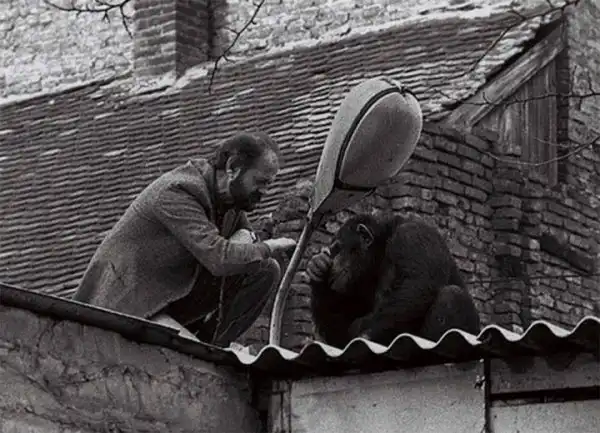 Директор Белградского зоопарка уговаривает сбежавшего шимпанзе вернуться в зоопарк, 1988 год