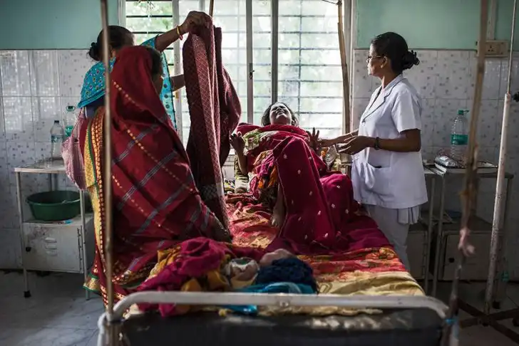 Назрин Хатун морщится от боли, страдая от тяжелой послеродовой анемии в Гражданском госпитале в Тезпуре, Ассам, Индия. Апрель 2015 года