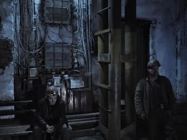 Двое горняков на угольной шахте Челюскинцев ждут лифт, который отвезет их на дно самой глубокой шахты. Они все еще работают, несмотря на постоянные обстрелы украинской артиллерии. Петровский район, Донецк, Украина
