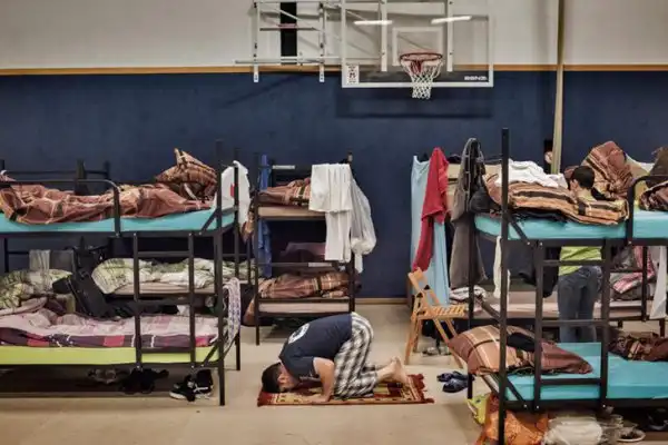 Беженец молится на полу приюта в районе Пренцлауэр-Берг, на северо-востоке Берлина. Около 200 мигрантов были размещены немецкими добровольцами менее чем за два часа