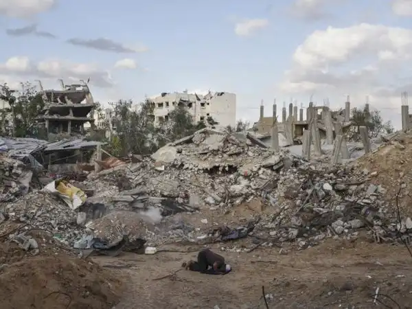 Палестинец молится в Газе, уничтоженной в прошлом году во время войны между группировкой ХАМАС и Израилем