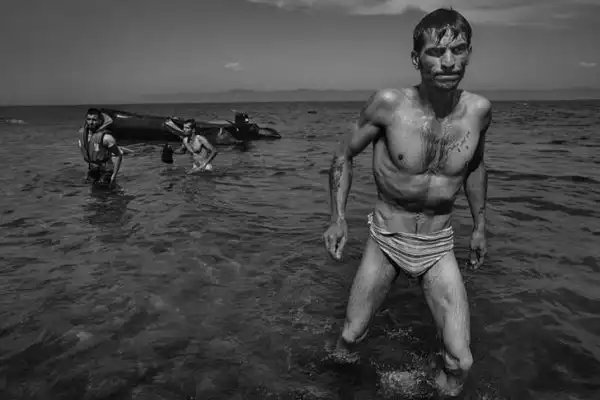 Мигрант идет к берегам Лесбоса, Греция, после переправы на надувной лодке из Турции