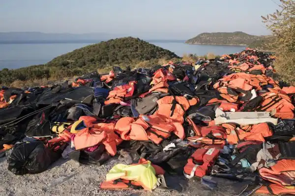 Берег острова Лесбос завален спасательными жилетами и сдутыми лодками, которые оставили беженцы после переправы из Турции