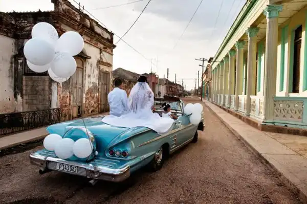 Молодожены едут в американском ретроавтомобиле по улицам города Гуира-де-Мелена. В этом процветающем районе в пригороде Гаваны стоимость свадьбы может достигать 20 000 долларов