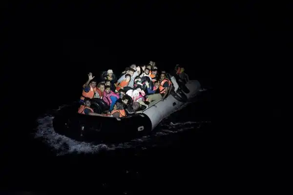 Мигранты на греко-турецкой границе. Лица людей освещены фонариками представителей береговой охраны, которые прибыли, чтобы спасти беженцев