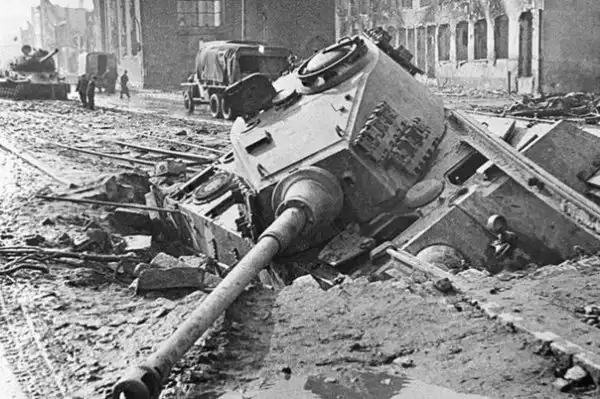 Брошенный "Королевский Тигр" на улице Берлина. Май 1945 года