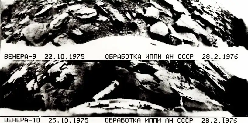 В октябре 1975 года космические аппараты "Венера-9" и "Венера-10" осуществили посадку на освещенной стороне Венеры на расстоянии 2200 км друг от друга и передали на Землю первые панорамы поверхности с мест посадок. На фото: изображение поверхности Венеры в месте посадки спускаемых аппаратов "Венера-9" и "Венера-10"