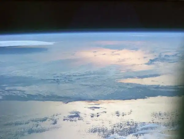 Вид на Землю с космической станции "Салют-7". Съемка выполнена космонавтами Александром Волковым, Виктором Савиных и Владимиром Васютиным, 6 июня 1986 года
