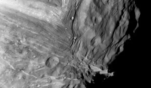 Миранда - самый близкий к планете и наименьший из пяти крупных спутников Урана. Он был исследован с близкого расстояния лишь одним космическим аппаратом - Voyager 2, изучавшим систему планеты в январе 1986 года. С Мирандой он сблизился теснее, чем с другими спутниками Урана, и поэтому заснял ее детальнее. Но удалось изучить только южное полушарие, потому что северное было погружено во тьму. На фото: снимок Миранды, 24 января 1986 года
