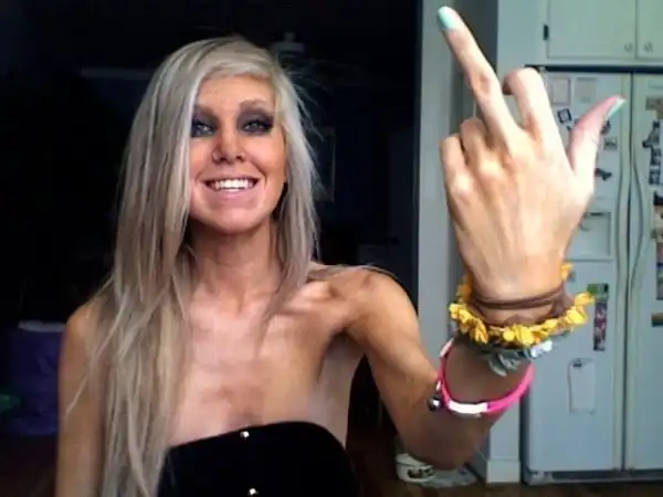 Мишель Алессандра была довольно симпатичной девушкой-подростком. До тех пор, пока не начала худеть. За короткий период времени она сбросила около 30 кг и сейчас выглядит как ходячий скелет. Но страшно не столько это, сколько тот факт, что у нее огромное количество поклонниц, считающих ее примером для подражания. От этой барышни (вернее от того, что от нее осталось) тащатся девочки-подростки и спрашивают, как она добилась веса в 35 кг при росте 174 см. А советов у Мишель не так много: не ешь, кури и пей вино.