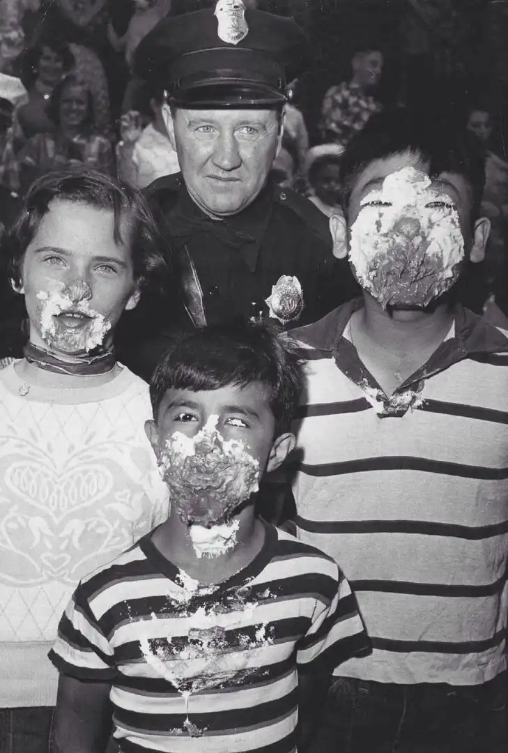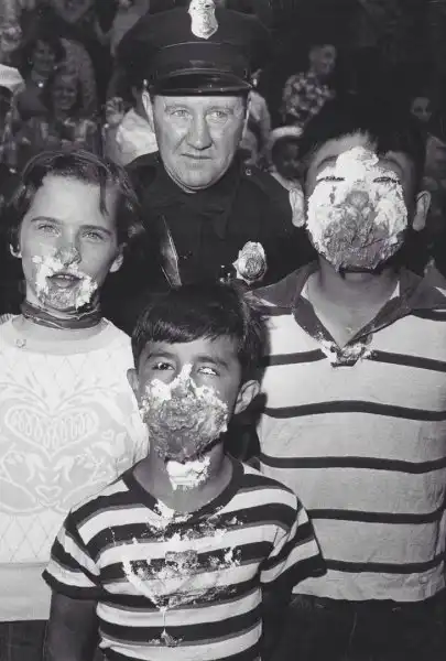Патрульный из Денвера Джо Хейл позирует с победителями конкурса по поеданию пирогов, 13 мая 1954 года.