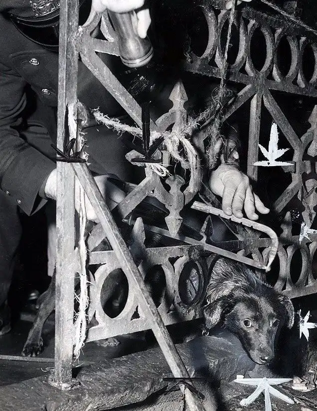 Полицейский спасает бродячую собаку, застрявшую в железном заборе. США, Нью-Йорк, 27 января 1958 года