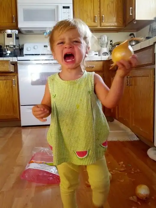 Как рассказал автор этих фото, его дочь захотела съесть яблоко. Но вместо яблока бедняжка взяла луковицу и от души откусила большой кусок. В этот момент бедный ребенок понял, что жизнь полна разочарований и не так проста, как кажется. Что касается отца, он оказался тем еще троллем, который взялся за камеру вместо того, чтобы дать настоящее яблоко своей расстроенной дочери.