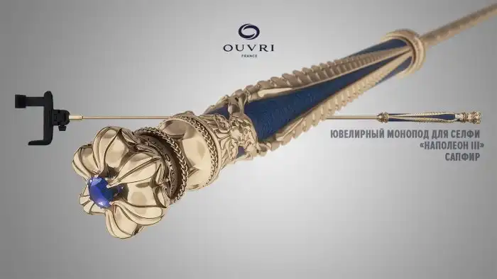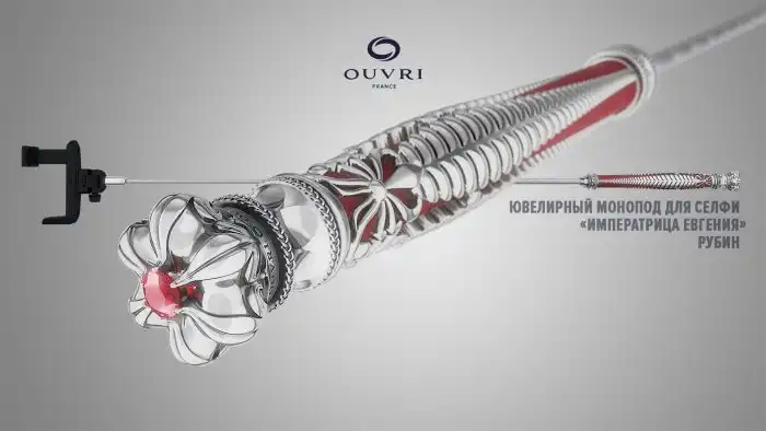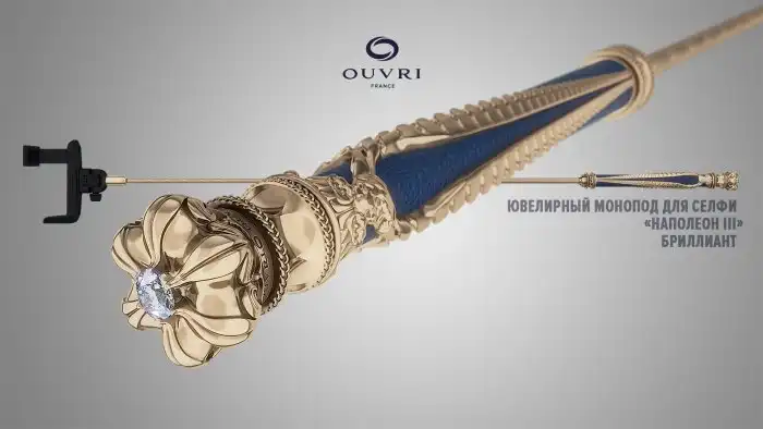 Специально для состоятельных любителей селфи французская компания OUVRI разработала специальный монопод, который в самой дорогой версии стоит 3 840 000 рублей. Похоже на шутку, не так ли, но это самая настоящая правда. Селфи-стик выполнен из серебра и покрыт золотом, а украшают его драгоценные камни. Рукоятку палки для селфи венчает корона, выполненная по эскизам короны последнего императора Франции Наполеона III. Над дизайном столь дорого аксессуара работала художница Инна Битон и наследники императорской семьи. Стоимость монопода будет зависеть от украшающего его драгоценного камня. В самом дорогом варианте корону венчает бриллиант весом 2,2 карата. В версиях попроще используется рубин (399 000 рублей) или сапфир (341 000 рублей). Самая «дешевая» селфи-палка, в которой и вовсе нет камней, обойдется в 195 000 рублей.