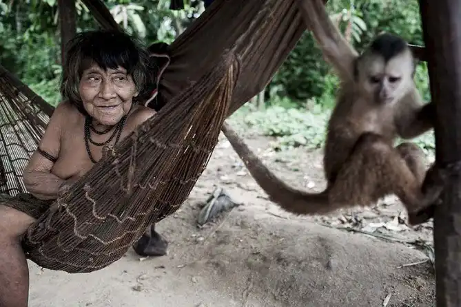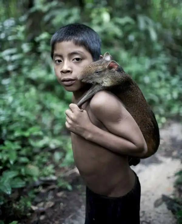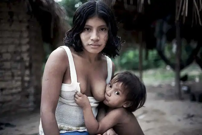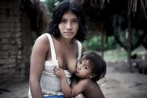Дело в том, что женщины этого племени, кроме собственных малышей выкармливают грудью разных диких животных, в частности белок. Практически у каждой семьи в племени ава есть прирученное домашнее животное, которое мать семейства кормит грудью, пока зверек не вырастет. Животных, выросших на грудном вскармливании, Ава не употребляют в пищу. Фотограф Доменико Пульезе делится наблюдениями: "Они кормят белок и обезьян точно так же, как кормят своих детей, - грудью. Они так близки к природе. На самом деле даже не близки - они являются частью природы! Глядя на обычаи и образ жизни этой народности, тебя вдруг осеняет и ты понимаешь, как далеко мы продвинулись..."