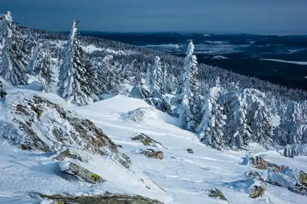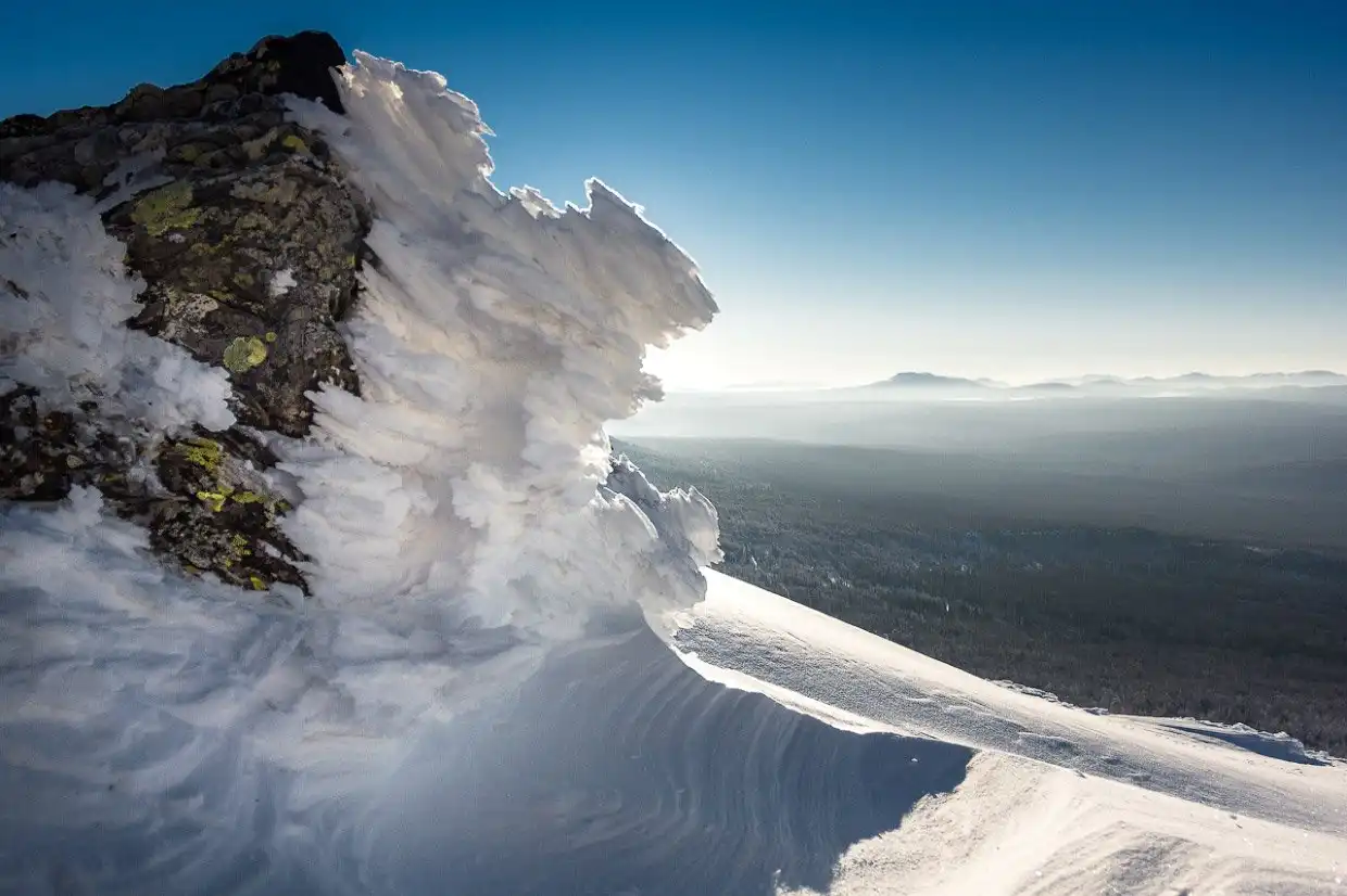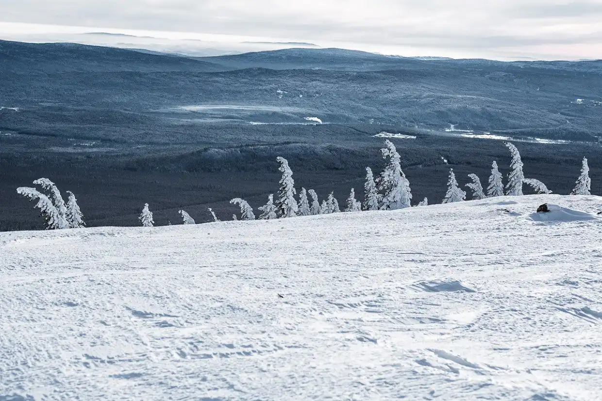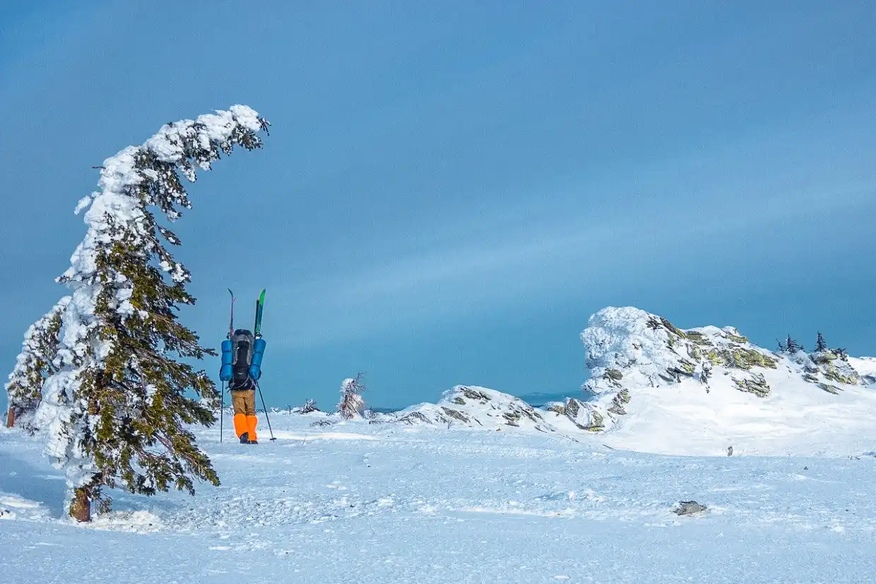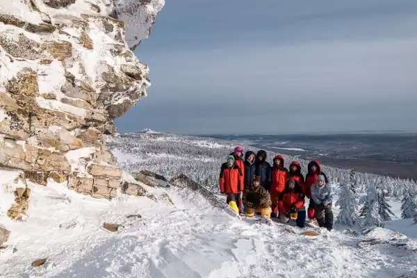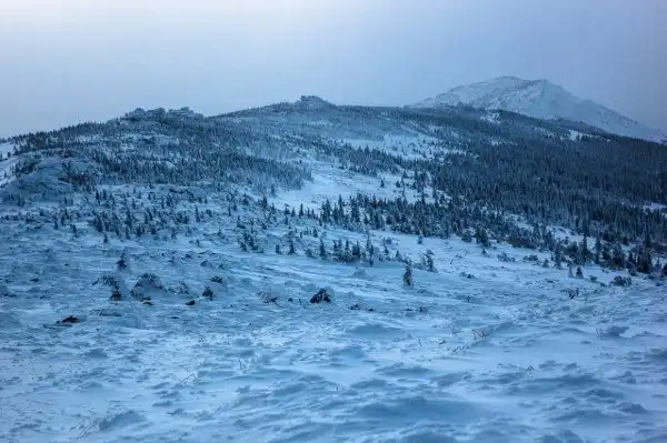 06.01.2016. Выспались и начали подъем пешком — вчерашние следы подмерзли и подниматься было удобно. Но вскоре лес кончился, пошел заснеженный курумник. Не очень приятно было проваливаться под наст между камней. Погода была ветреная и пасмурная, однако, в этом было что-то мистическое.