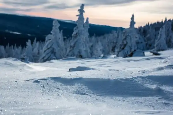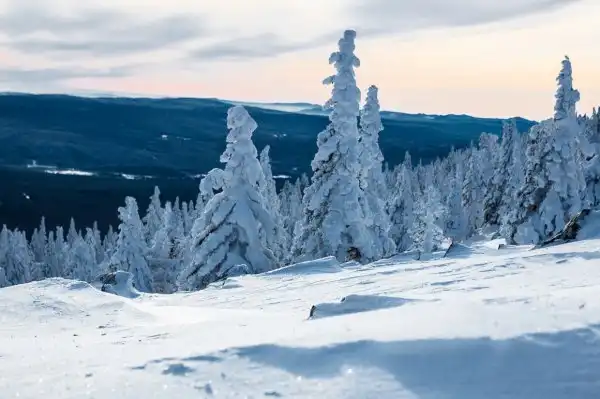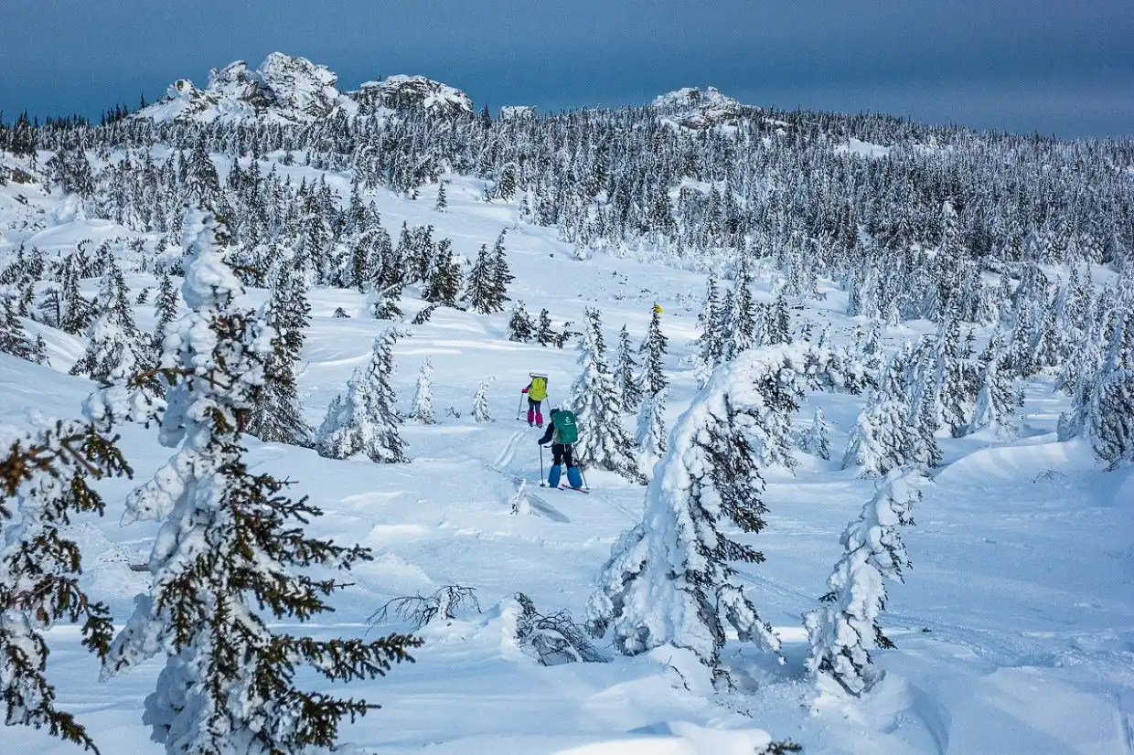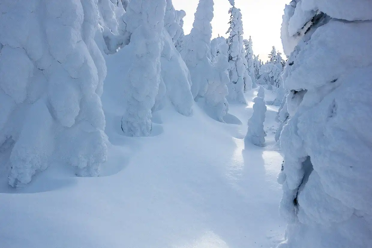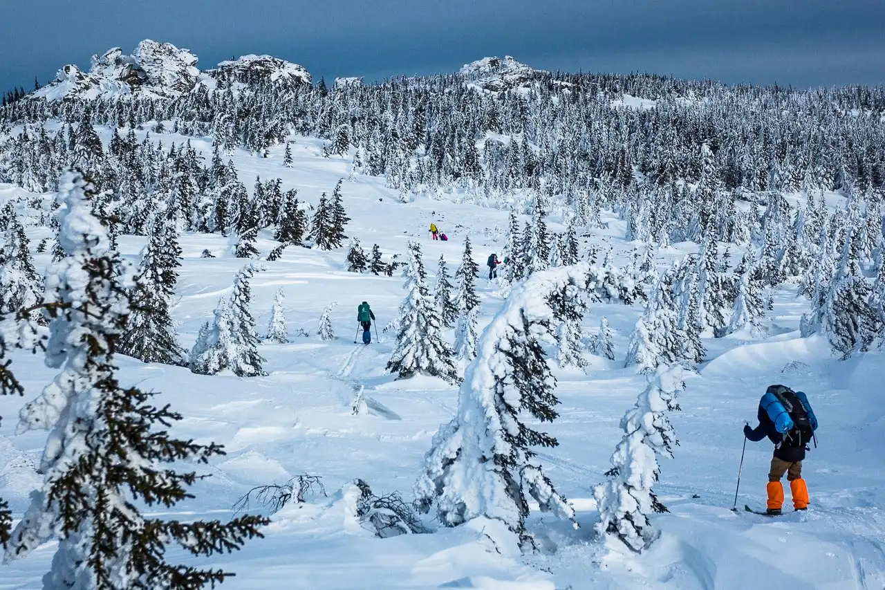 06.01.2016. Выспались и начали подъем пешком — вчерашние следы подмерзли и подниматься было удобно. Но вскоре лес кончился, пошел заснеженный курумник. Не очень приятно было проваливаться под наст между камней. Погода была ветреная и пасмурная, однако, в этом было что-то мистическое.