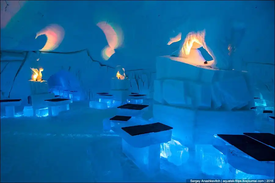 Ледяной ресторан. Столы и стулья тоже изо льда, посередине огромная фигура медведя, вырезанная из цельной снежной глыбы.