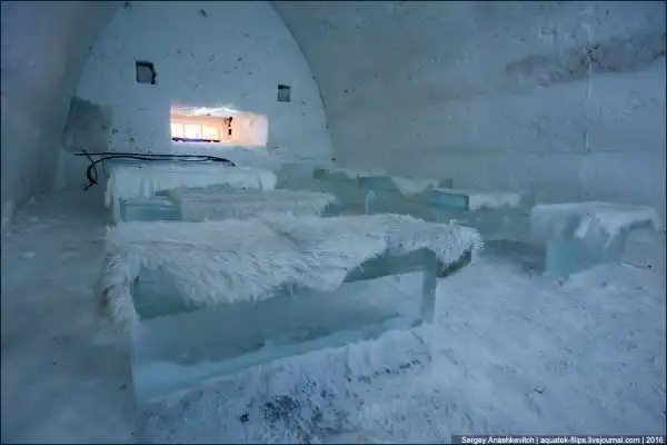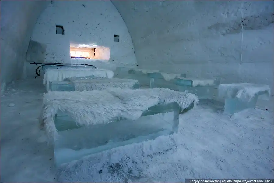 Это небольшой кинотеатр. Фильмы транслируют с помощью проектора прямо на белую снежную стену. Скамейки вырезаны изо льда, чтобы на них не было холодно сидеть, постелены оленьи шкуры.