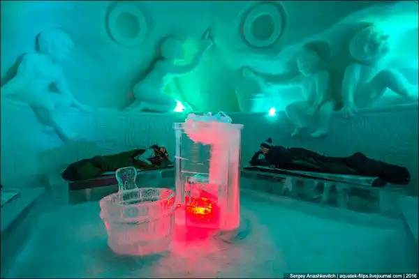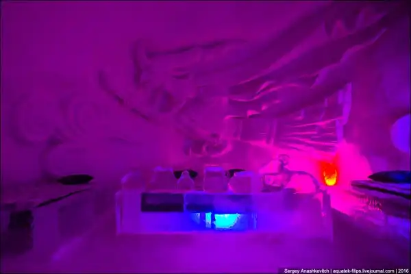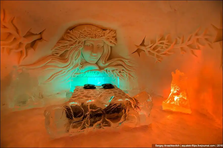 Все декорации тоже вырезаются из снега и льда. Кровати тоже во всех сюитах разные — каждая имеет свой уникальный резной дизайн.