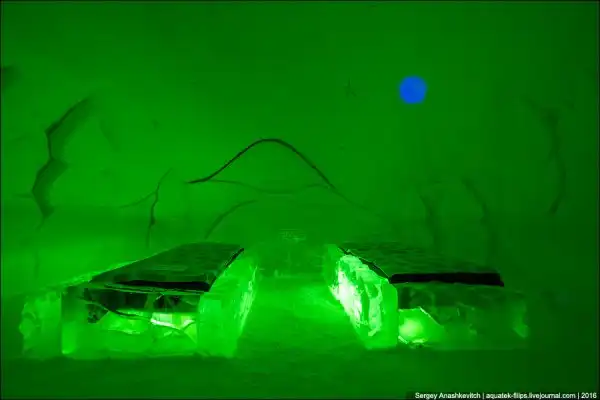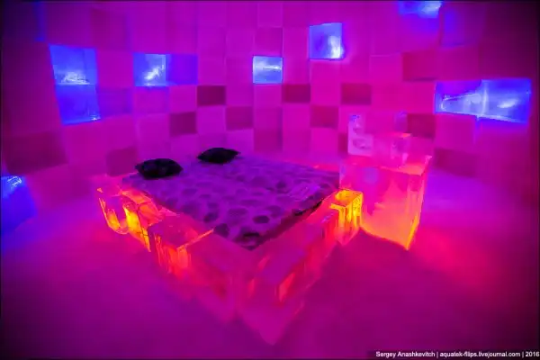 Подсветка встроена в ледяные блоки в стенах и непосредственно в кровать.