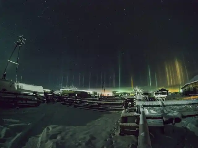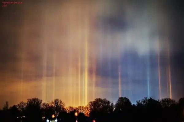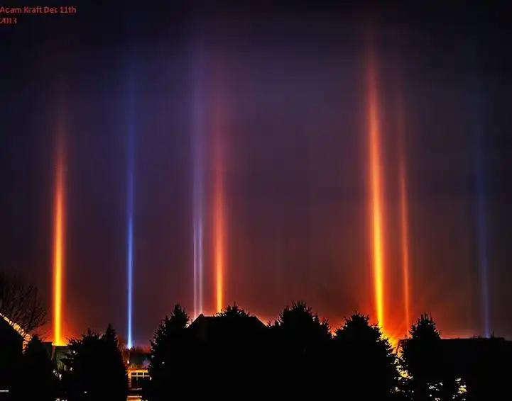 Световые или солнечные столбы – это довольно редкое атмосферное явление, которое можно наблюдать только при минусовых температурах. При определённых условиях, когда столбик термометра опускается ниже нуля, в воздухе формируются плоские шестигранные кристаллы, способные отражать яркий солнечный или искусственный свет. По сути, световой столб представляет собой вертикальную полосу света, преломляющегося в ледяных кристаллах, когда Солнце находится на определённой высоте над горизонтом. Световые столбы часто принимают за НЛО.