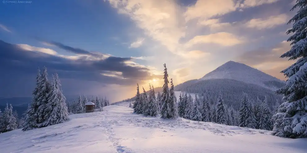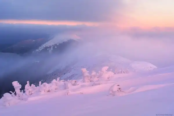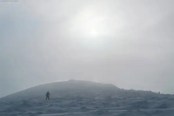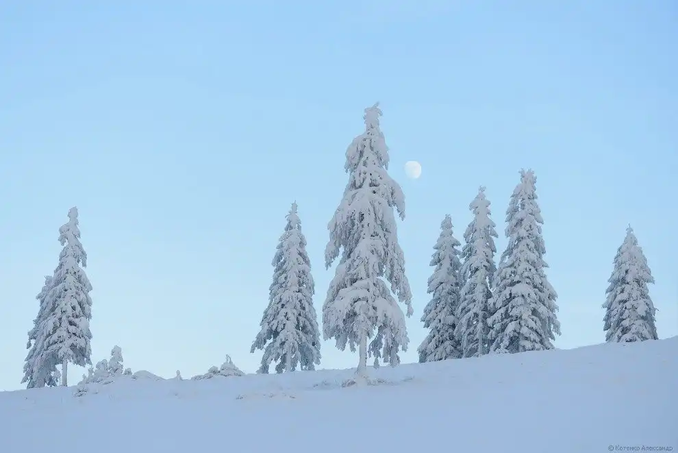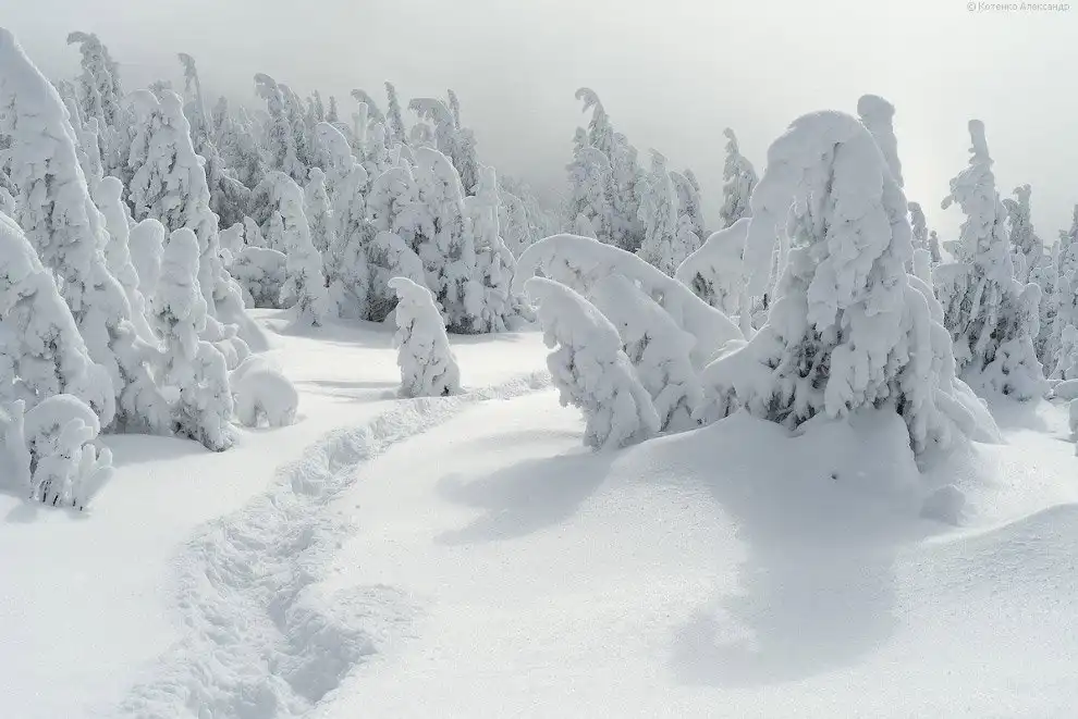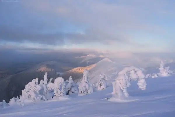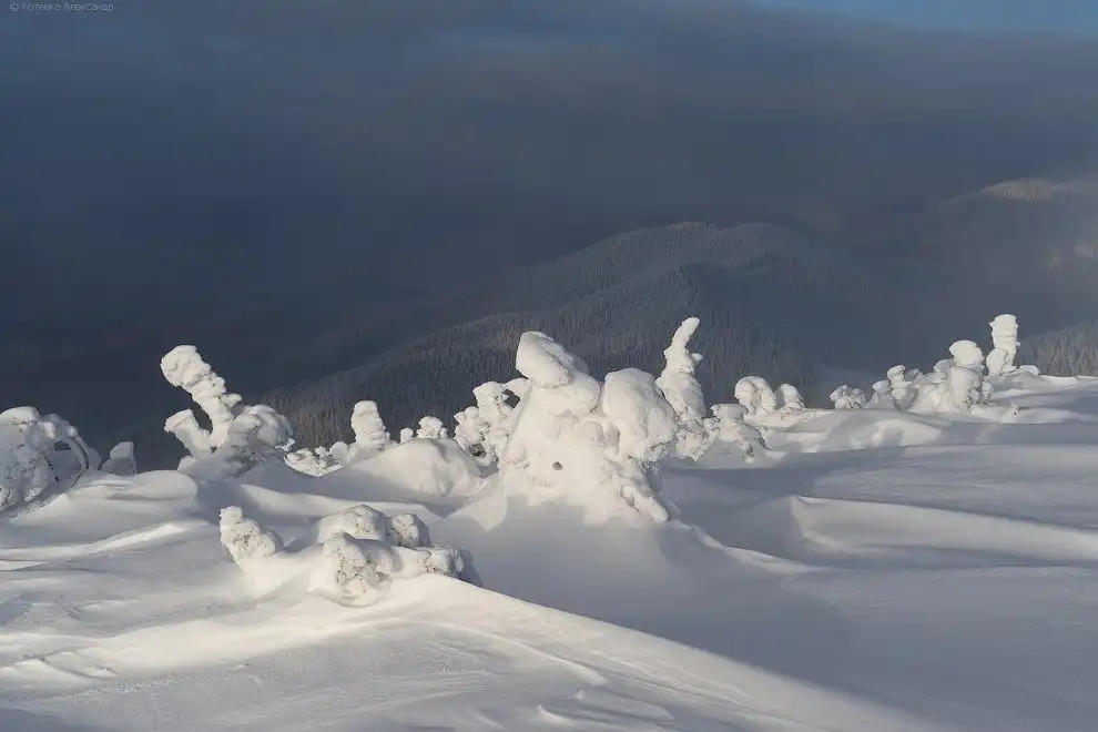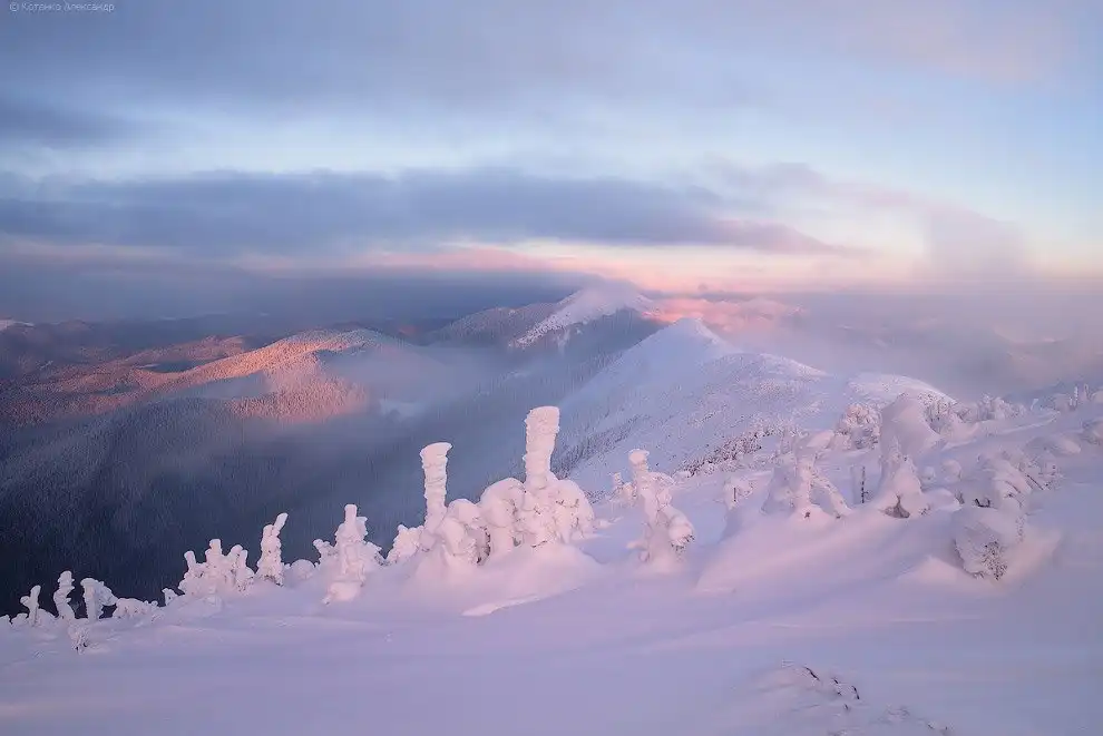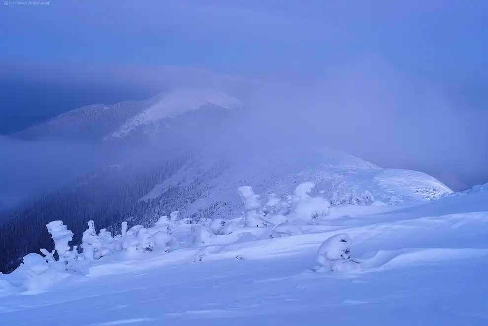 Первые три дня мы провели нигде. Но это нас лишь подзадорило. Поскольку безумству фотографов нет придела, мы решили под покровом ночи штурмовать гребень хребта, рассекая собой пронизывающий ветер. Чтобы на единственный прогнозируемый рассвет оказаться на вершине горы Синяк. Теперь я понял, откуда такое название. Часть дороги мы намеренно проложили по кустам жерепа, проваливаясь по пояс прямо в снегоступах, чтобы, собрав все усилия, выбираясь из этого капкана, разгонять кровь, тем самим нагревая усталые тела.