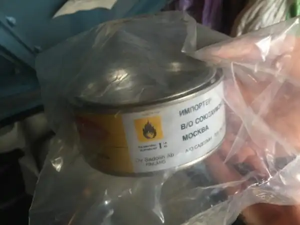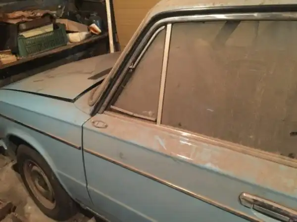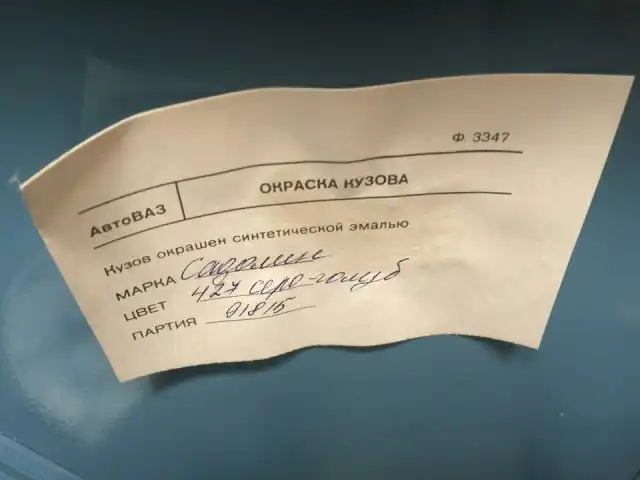 Кузов окрашен финской серо-голубой эмалью Sadolin, о чем свидетельствует бумажная бирка и запаянная в целлофановом пакете баночка (для локальных подкрасов) в багажнике. Там же лежали новые хромированные колпаки, завернутые в бумаги.